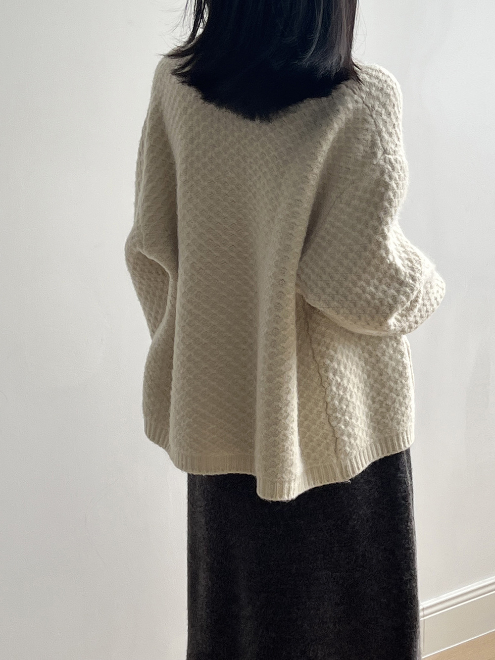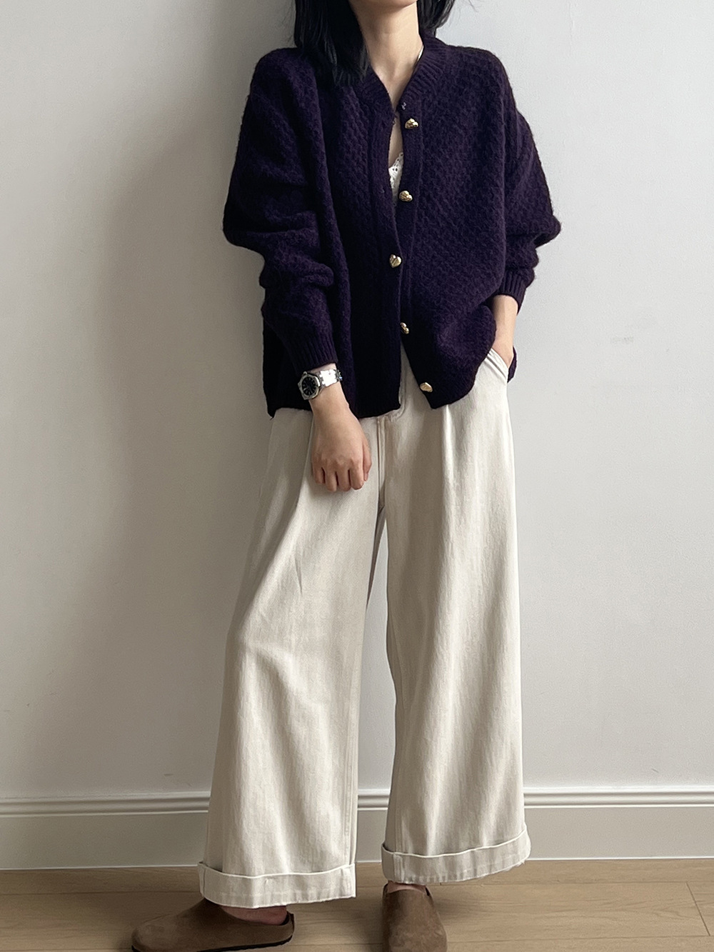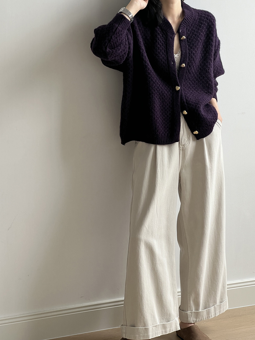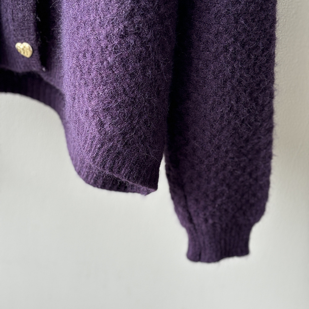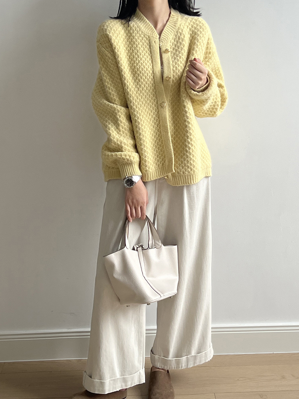 *o-ha-you*【FYSA105】菠蘿紋愛心扣圓領毛衣2024秋冬寬鬆軟糯慵懶風針織開襟衫-3色-香檳黃有現貨