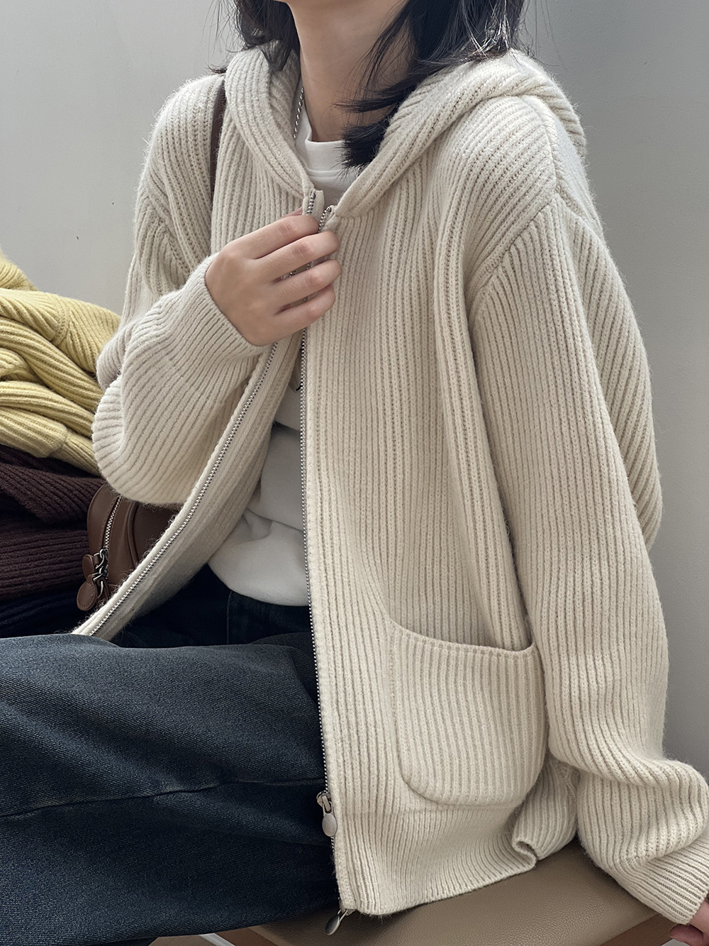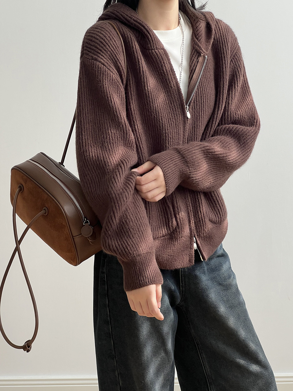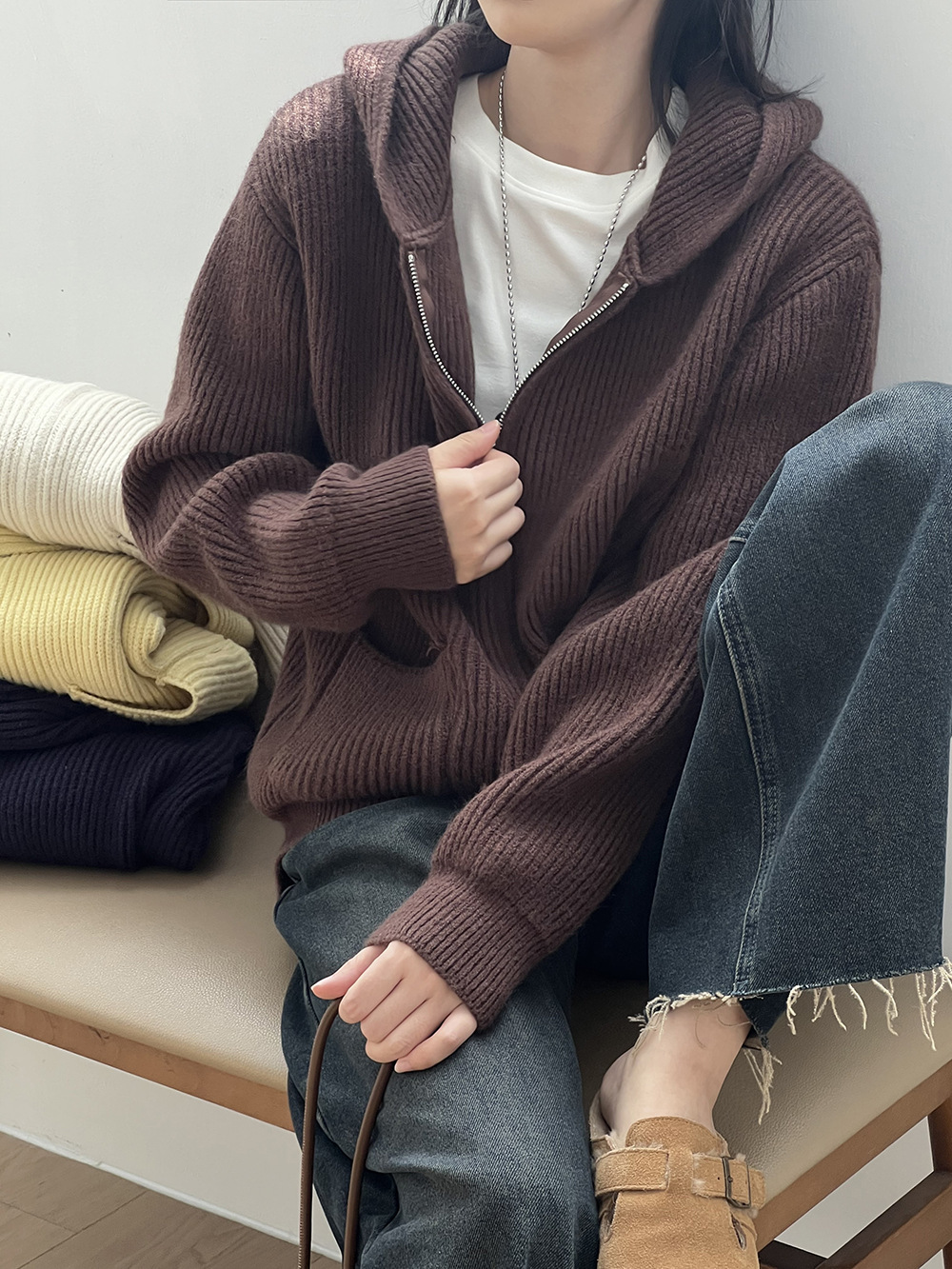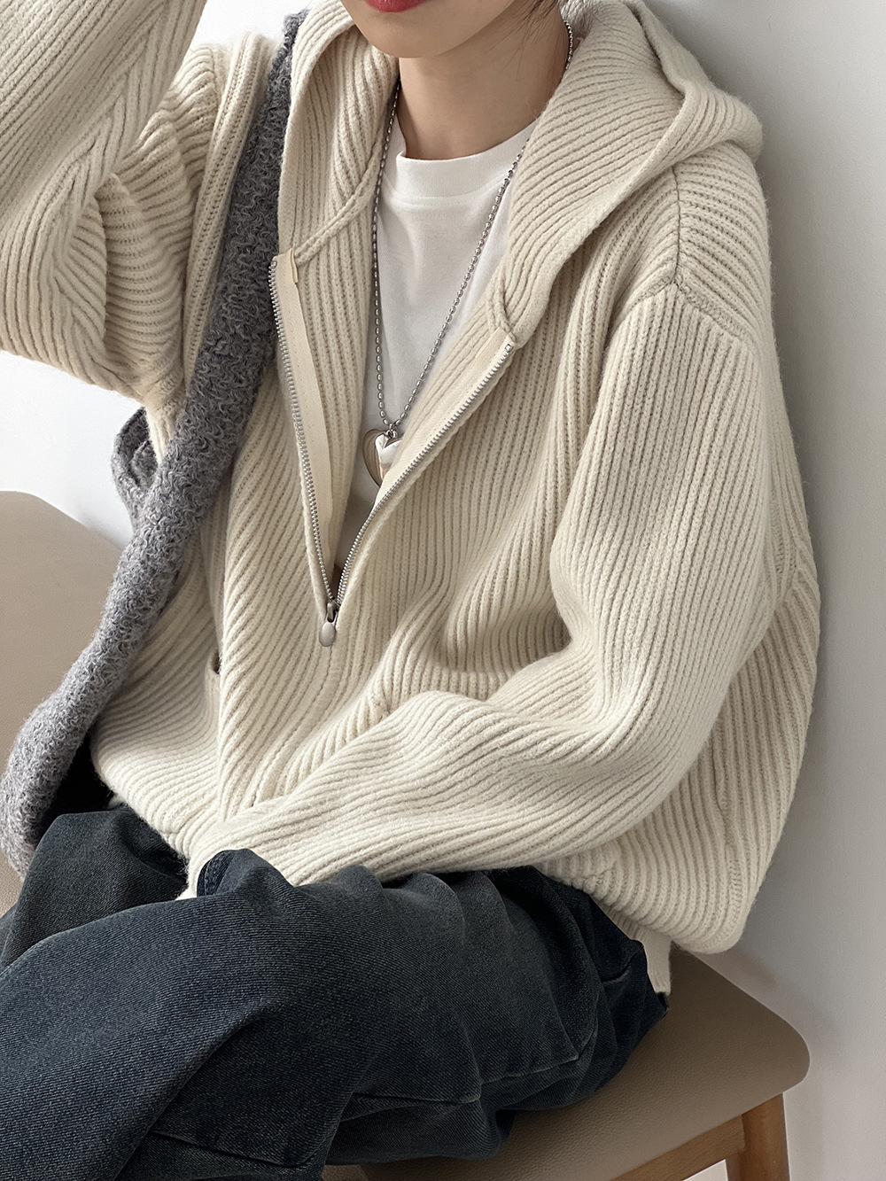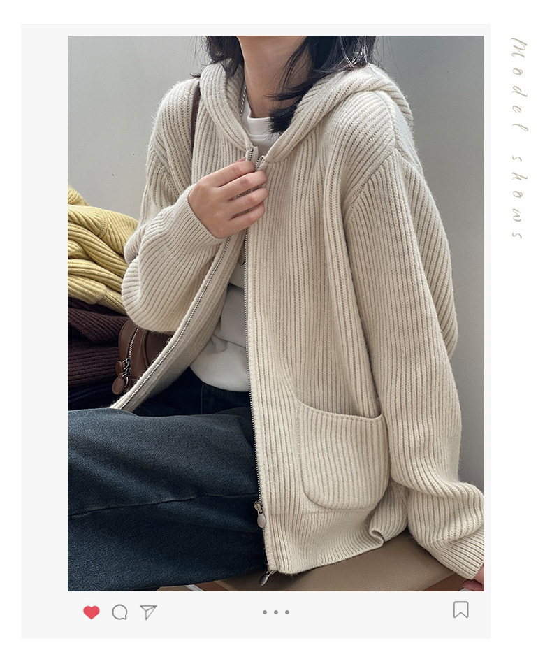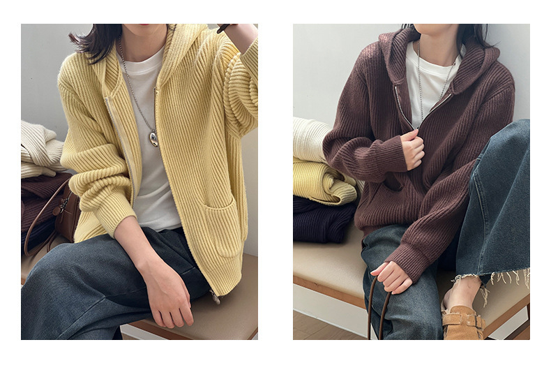 *o-ha-you*【FYSA201】軟糯連帽雙拉鍊毛衣外套2024秋冬新款簡約寬鬆針織開襟衫-4色-如有需要請先諮詢