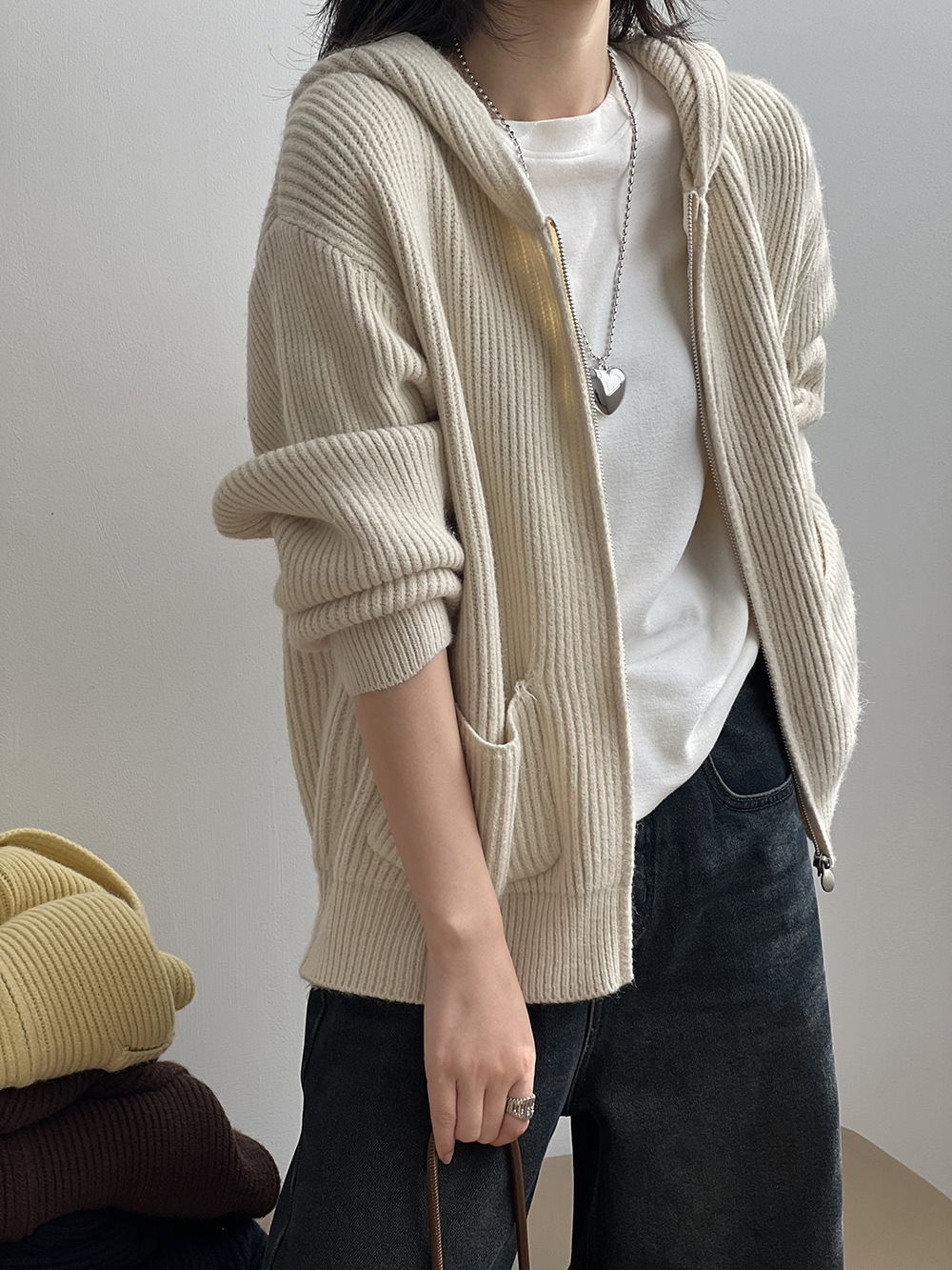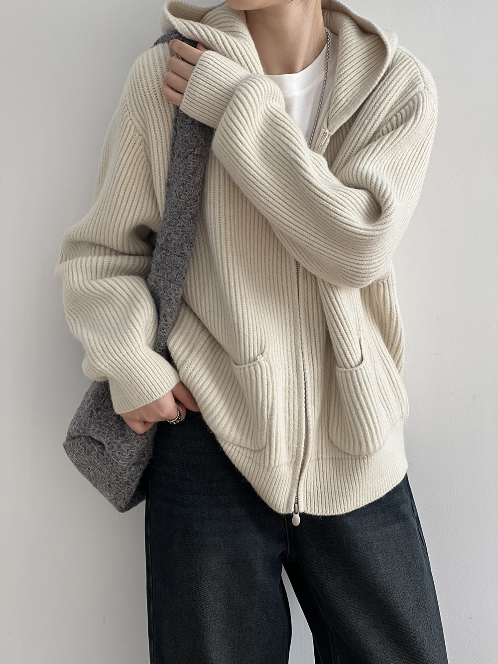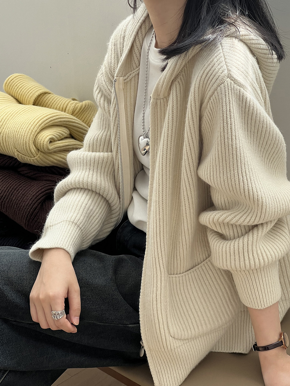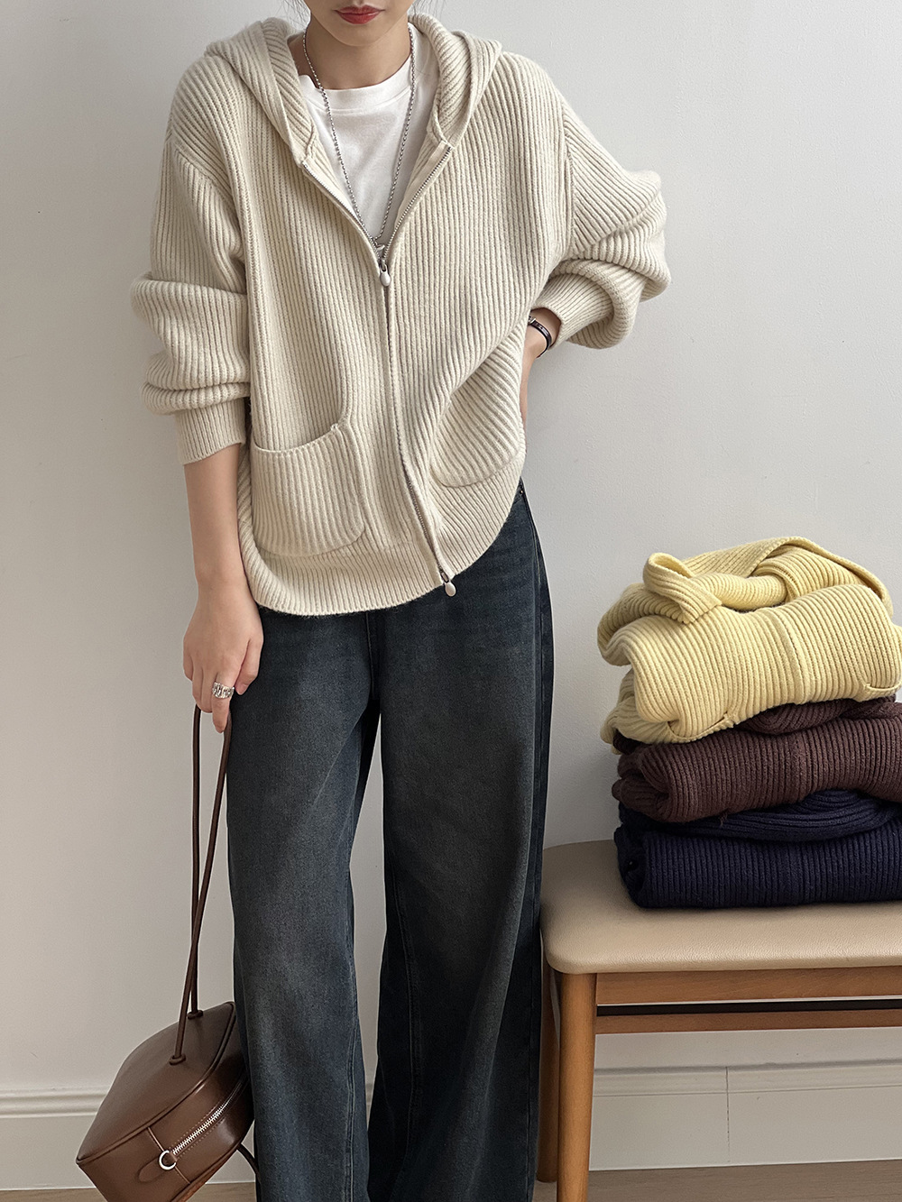 *o-ha-you*【FYSA201】軟糯連帽雙拉鍊毛衣外套2024秋冬新款簡約寬鬆針織開襟衫-4色-如有需要請先諮詢