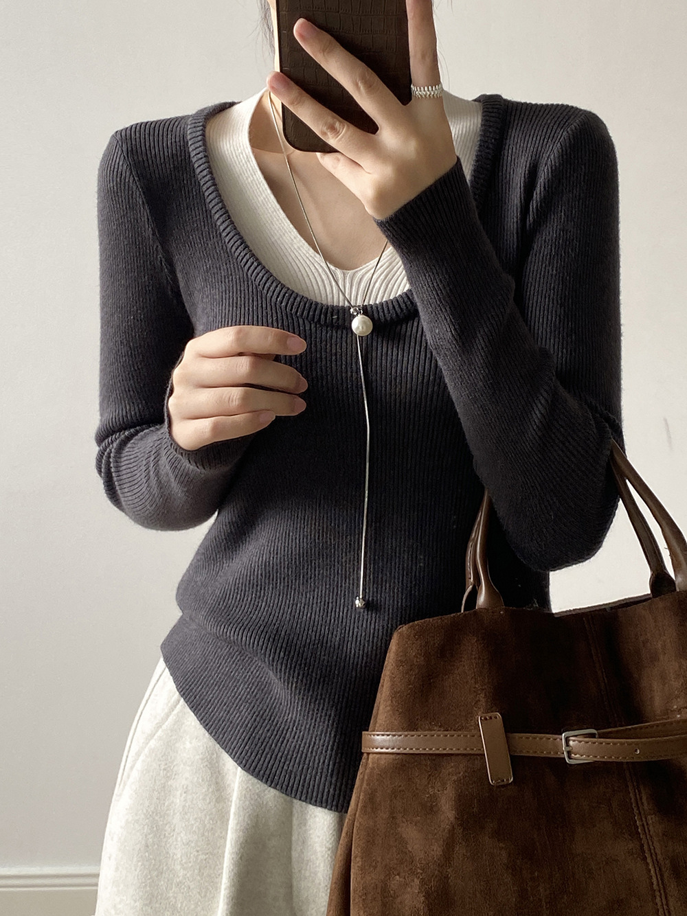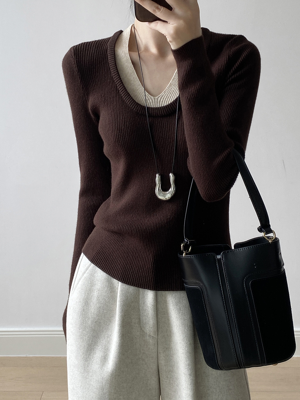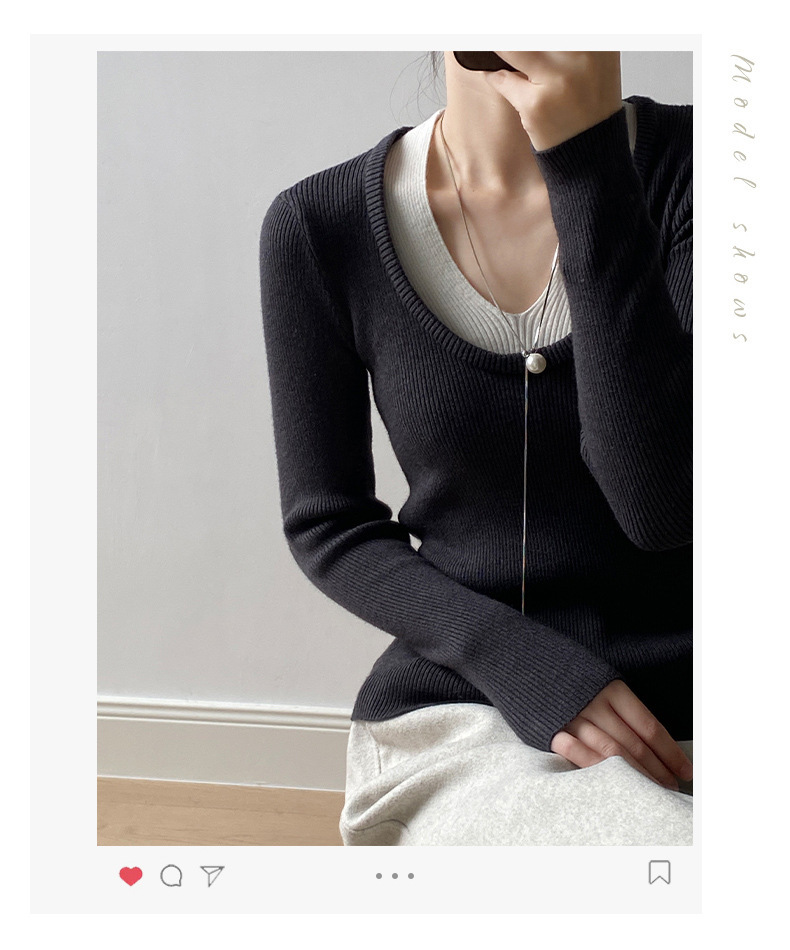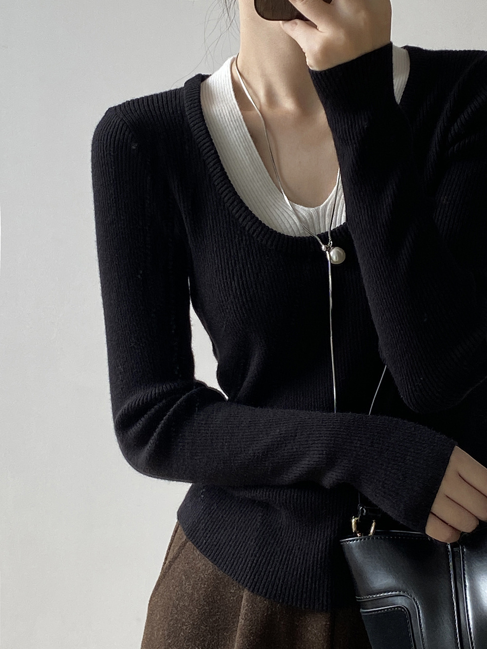 *o-ha-you*【FYSP10003】假兩件U領修身打底衫2024秋冬新款修身針織上衣-3色-如有需要請先諮詢