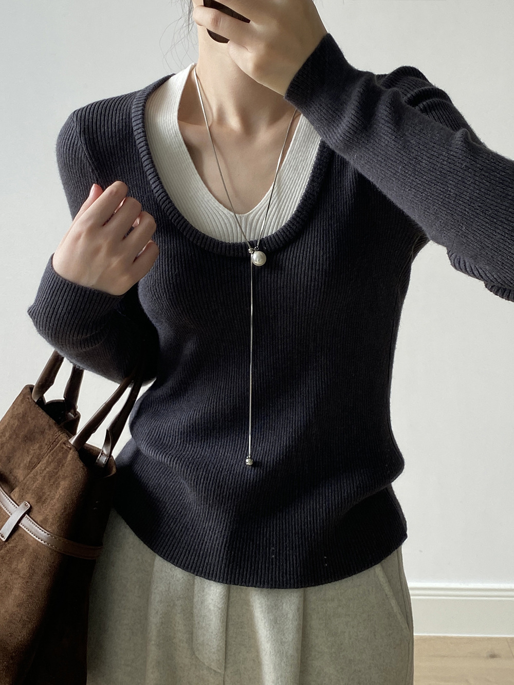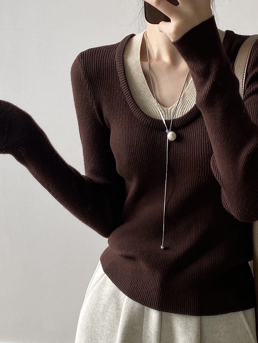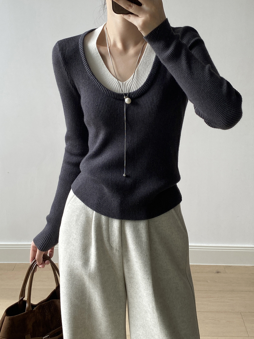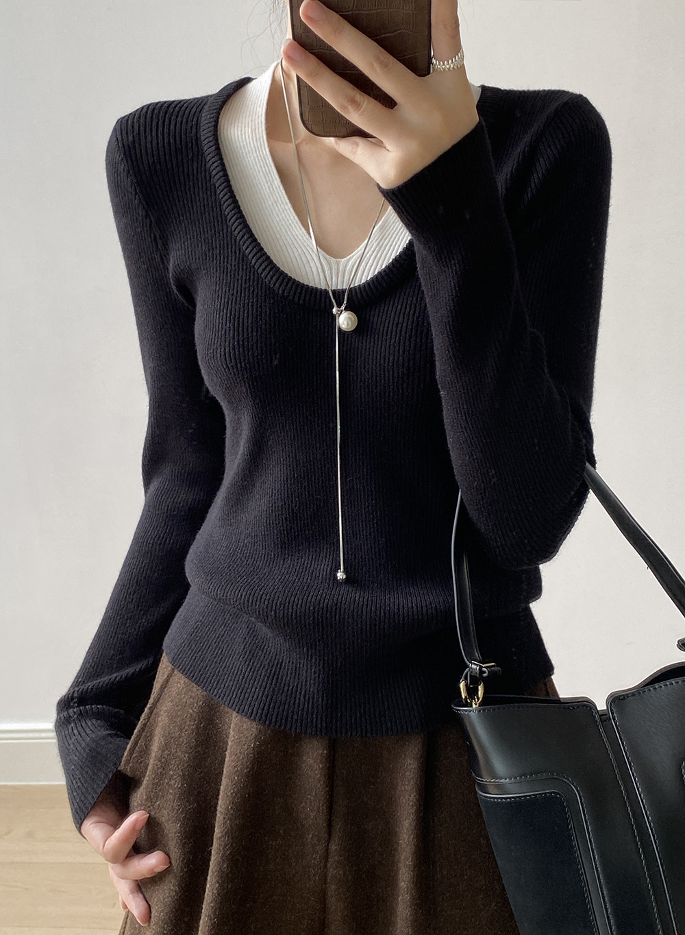 *o-ha-you*【FYSP10003】假兩件U領修身打底衫2024秋冬新款修身針織上衣-3色-如有需要請先諮詢