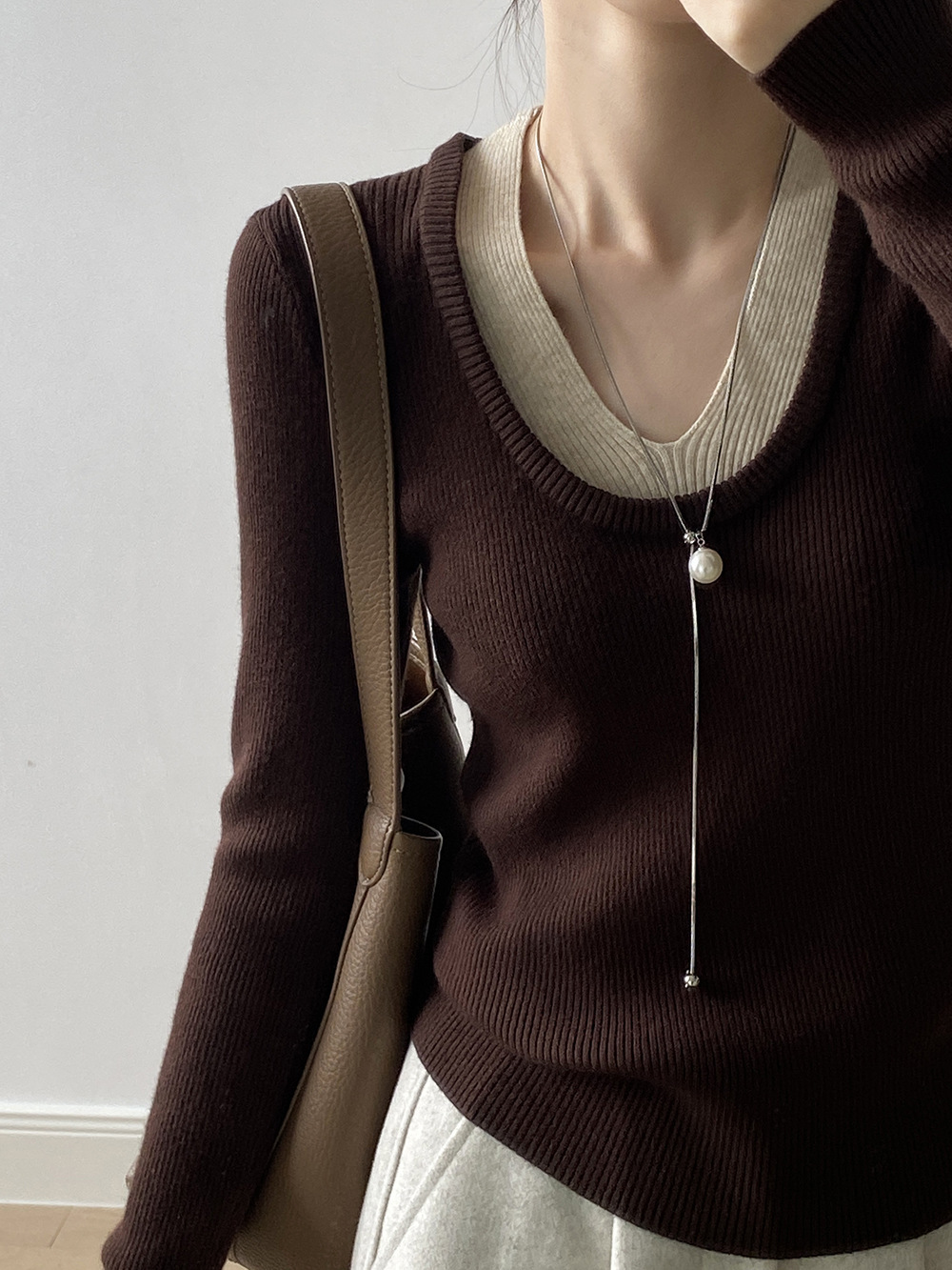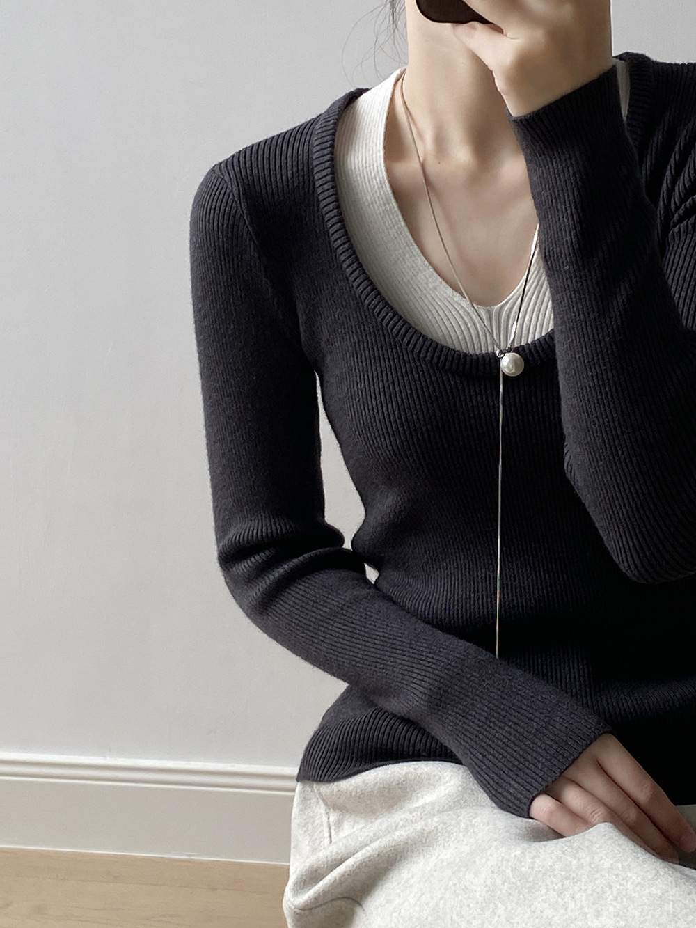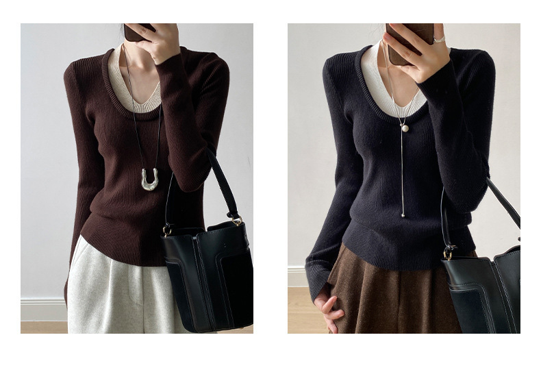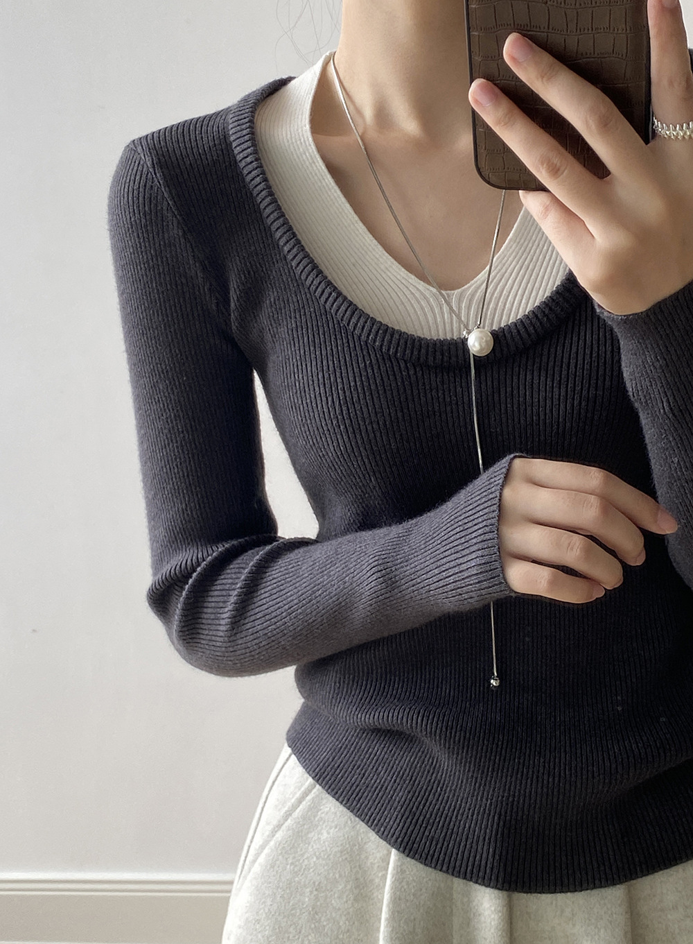 *o-ha-you*【FYSP10003】假兩件U領修身打底衫2024秋冬新款修身針織上衣-3色-如有需要請先諮詢