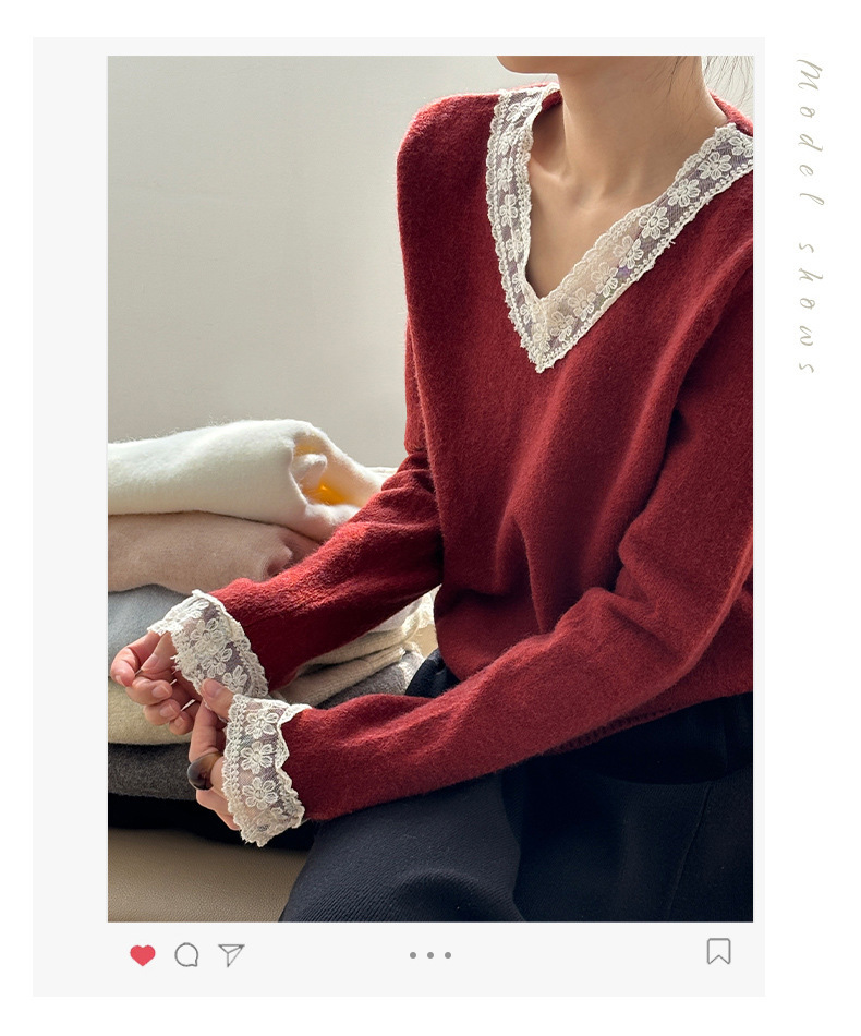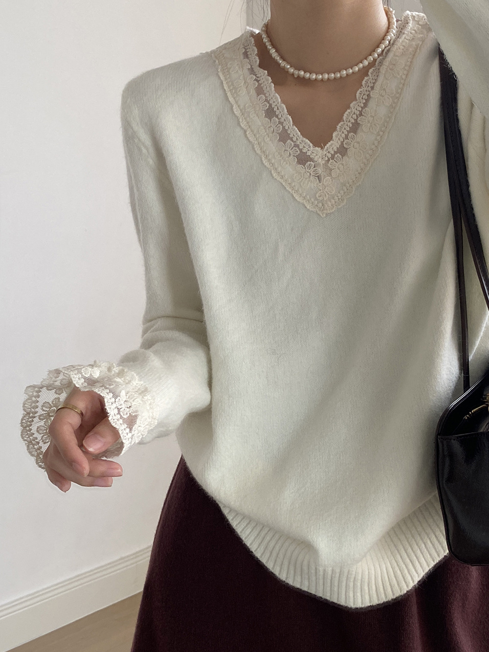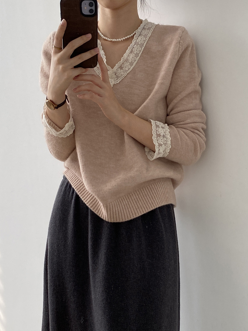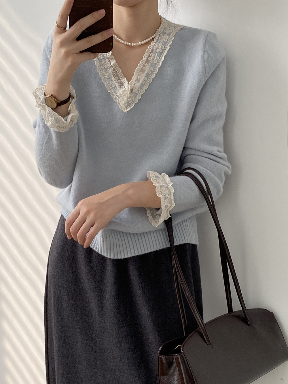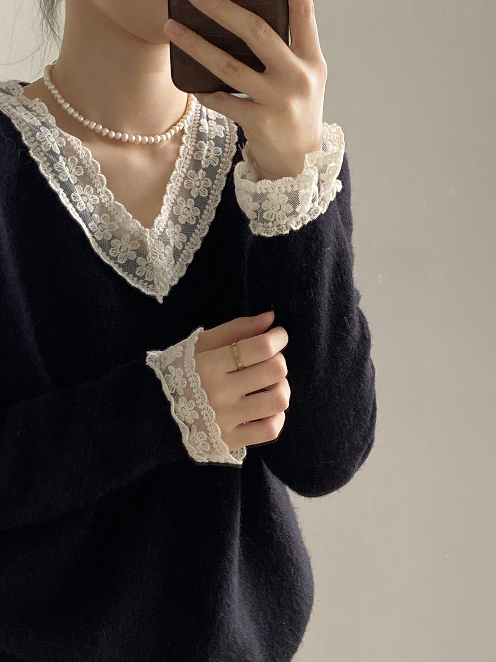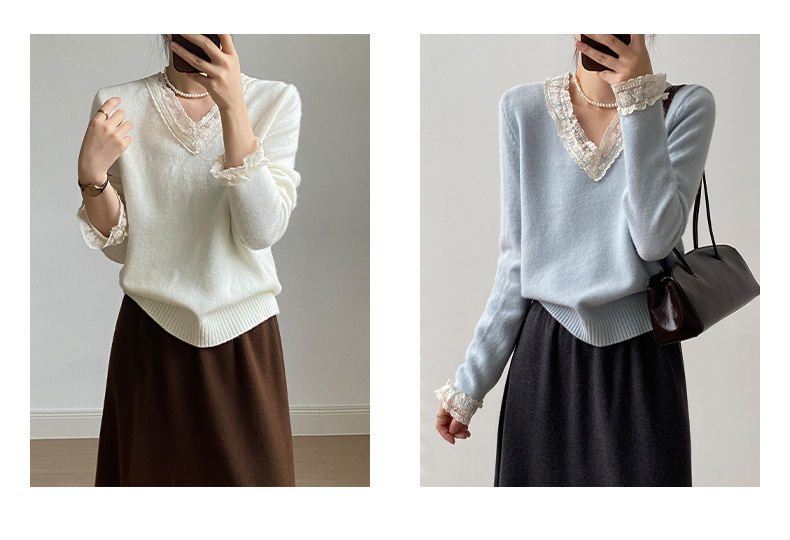 *o-ha-you*【FYSP10170】V領拼接蕾絲花邊打底衫 2024冬季寬鬆針織內搭上衣-7色-如有需要請先諮詢