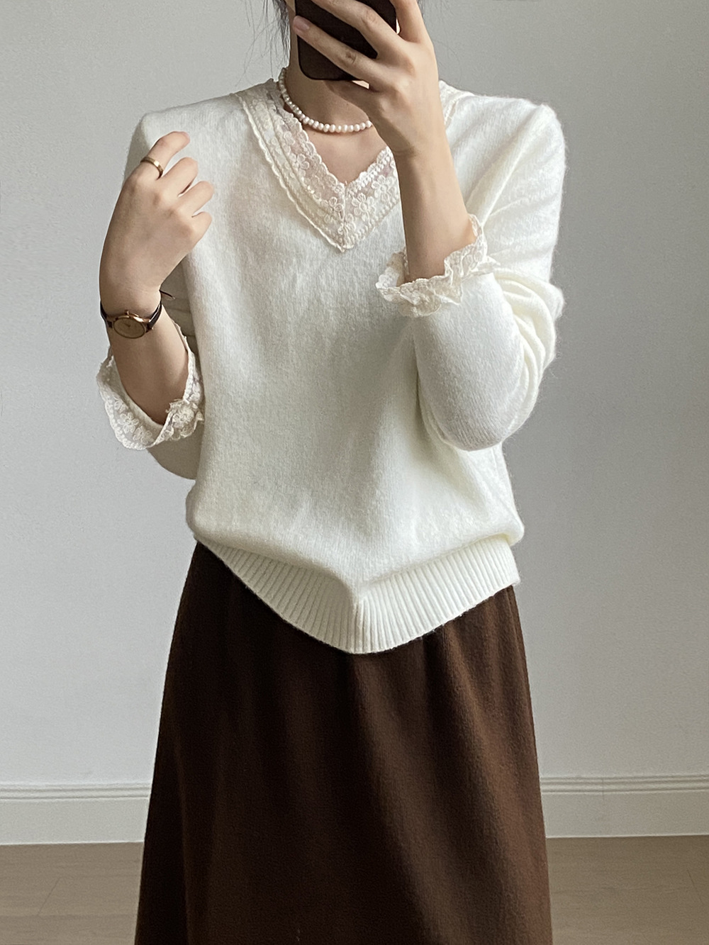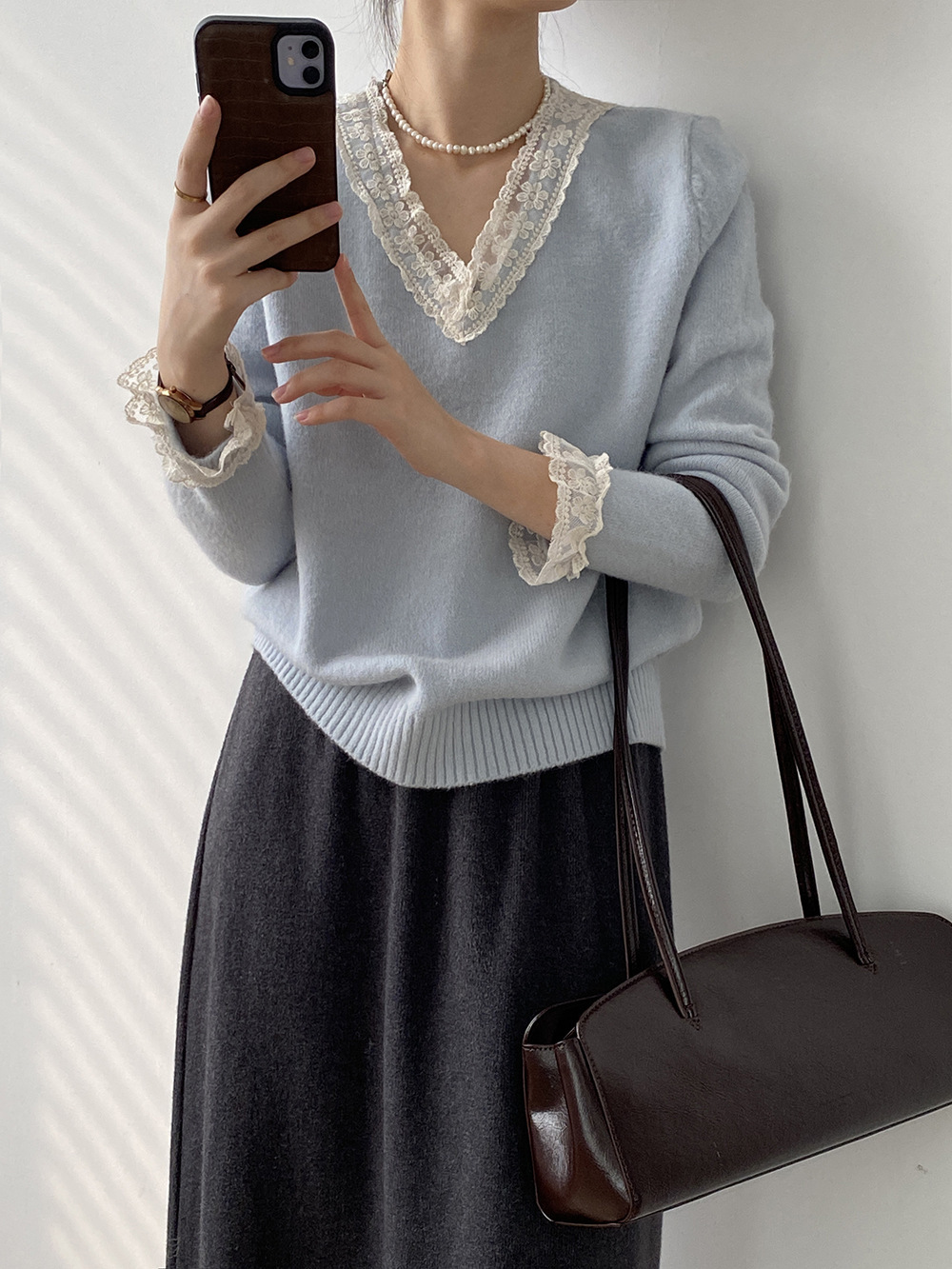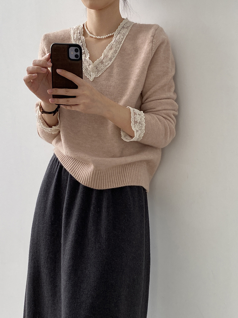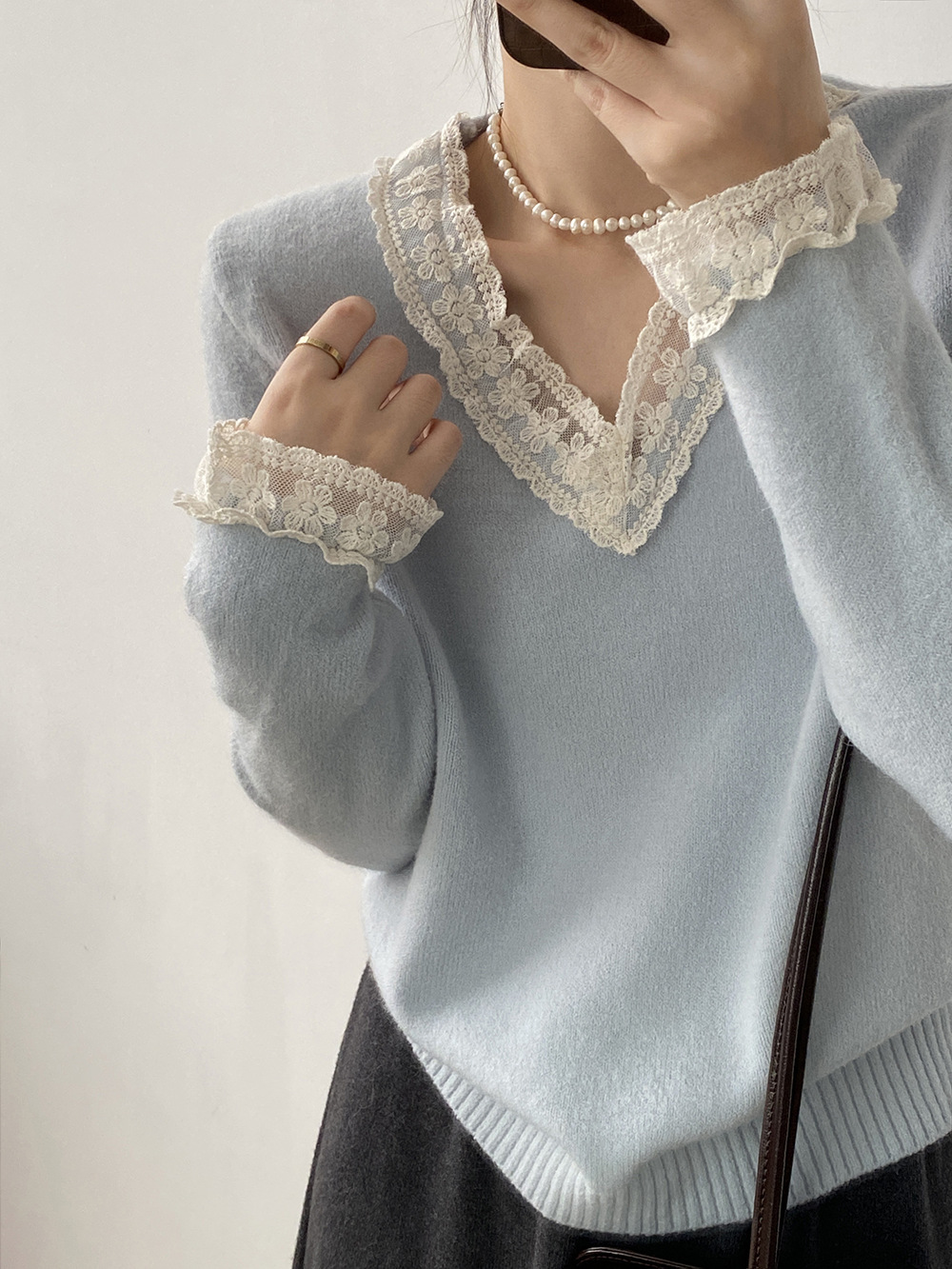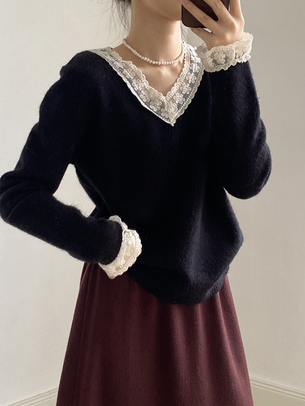 *o-ha-you*【FYSP10170】V領拼接蕾絲花邊打底衫 2024冬季寬鬆針織內搭上衣-7色-如有需要請先諮詢