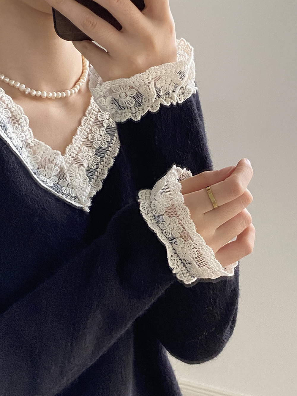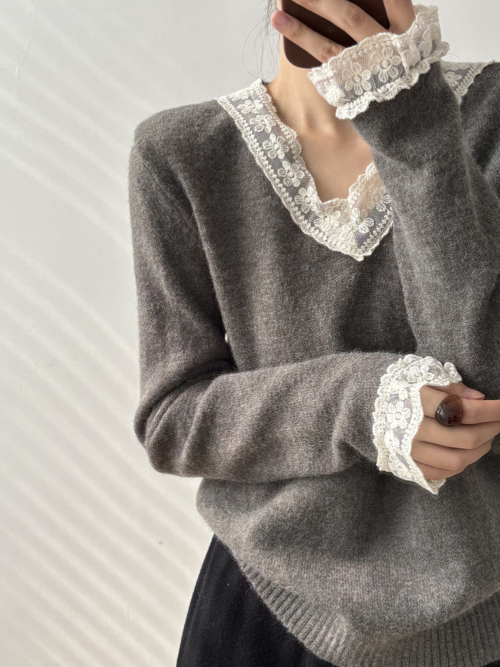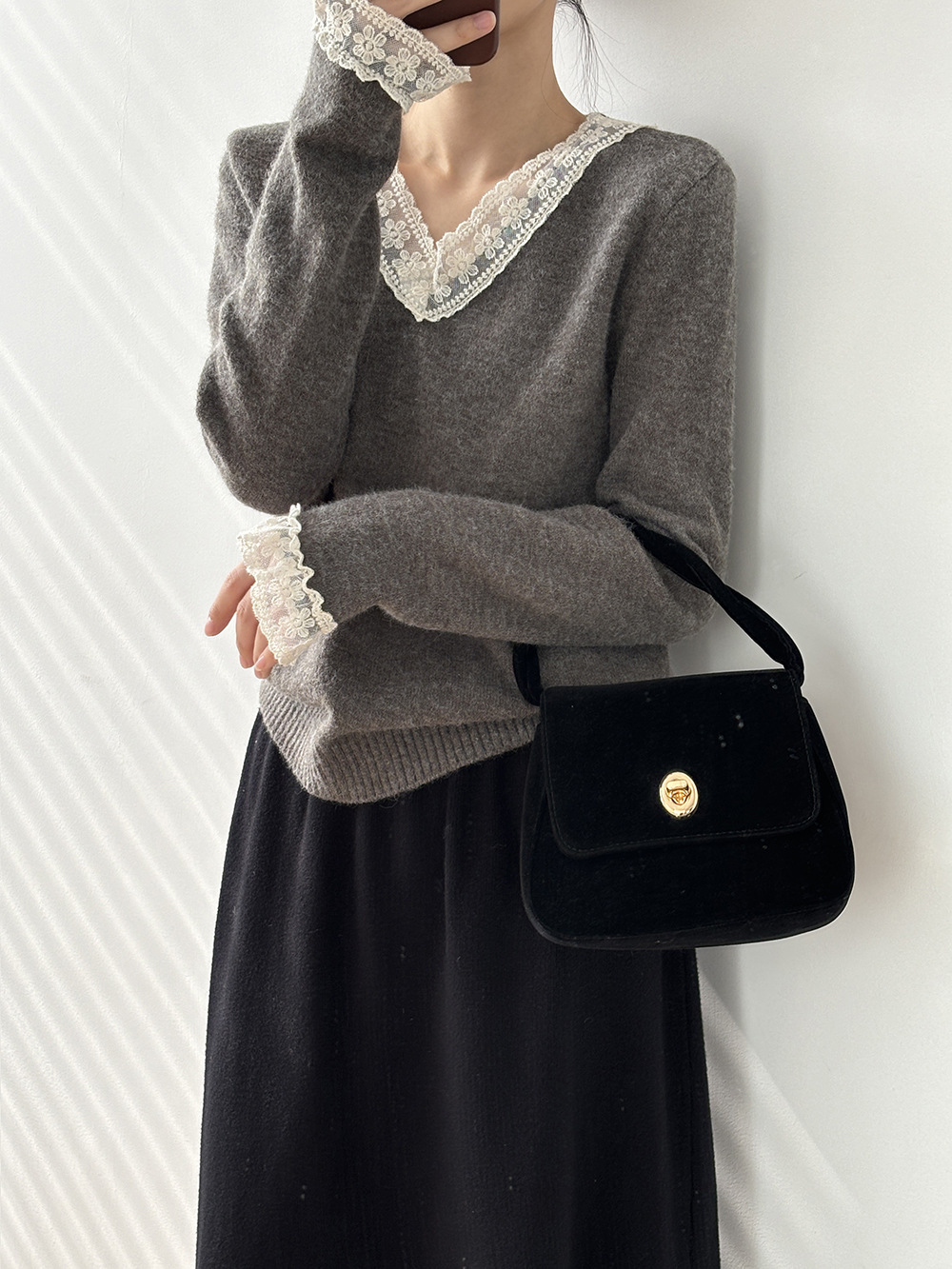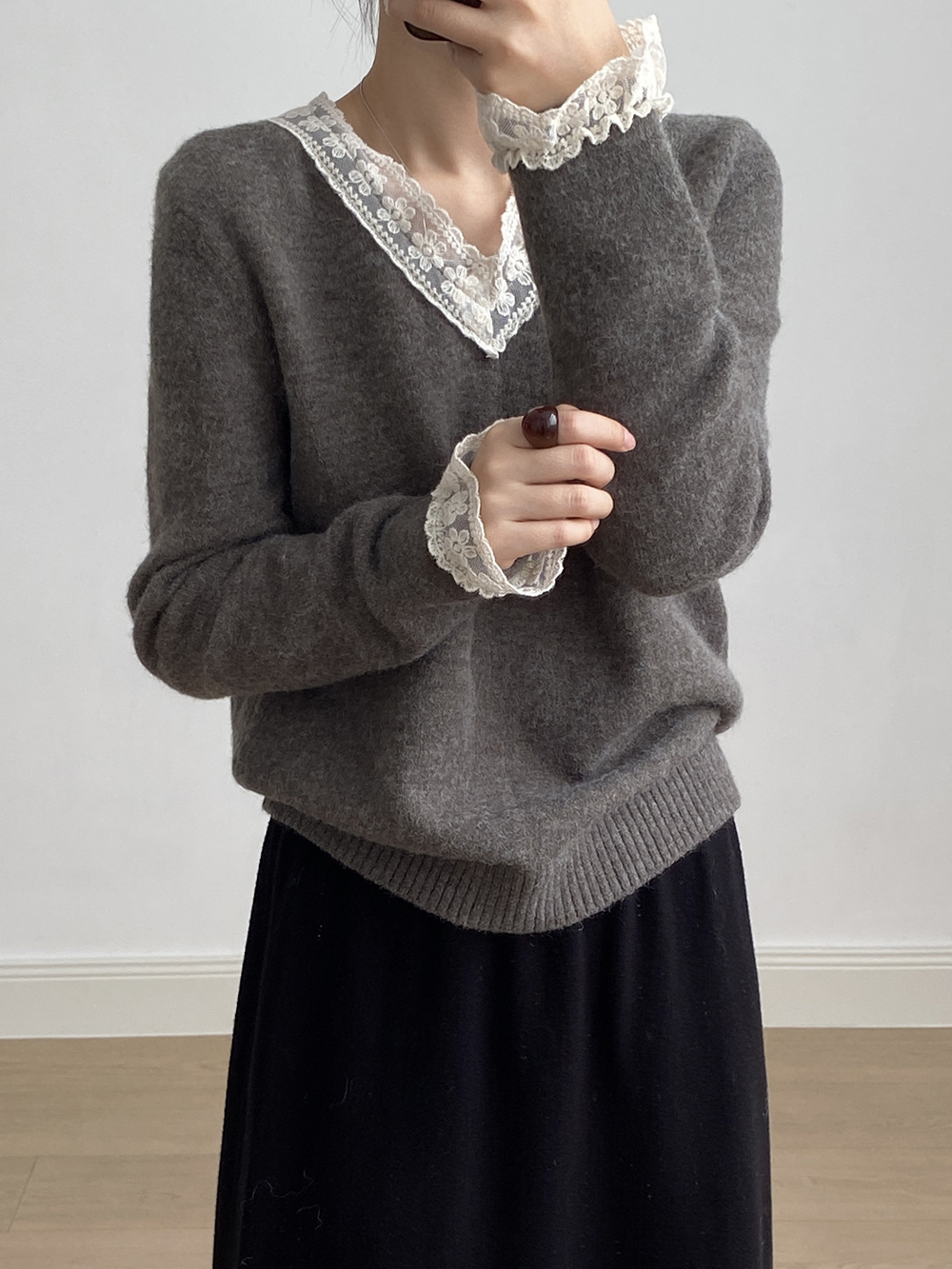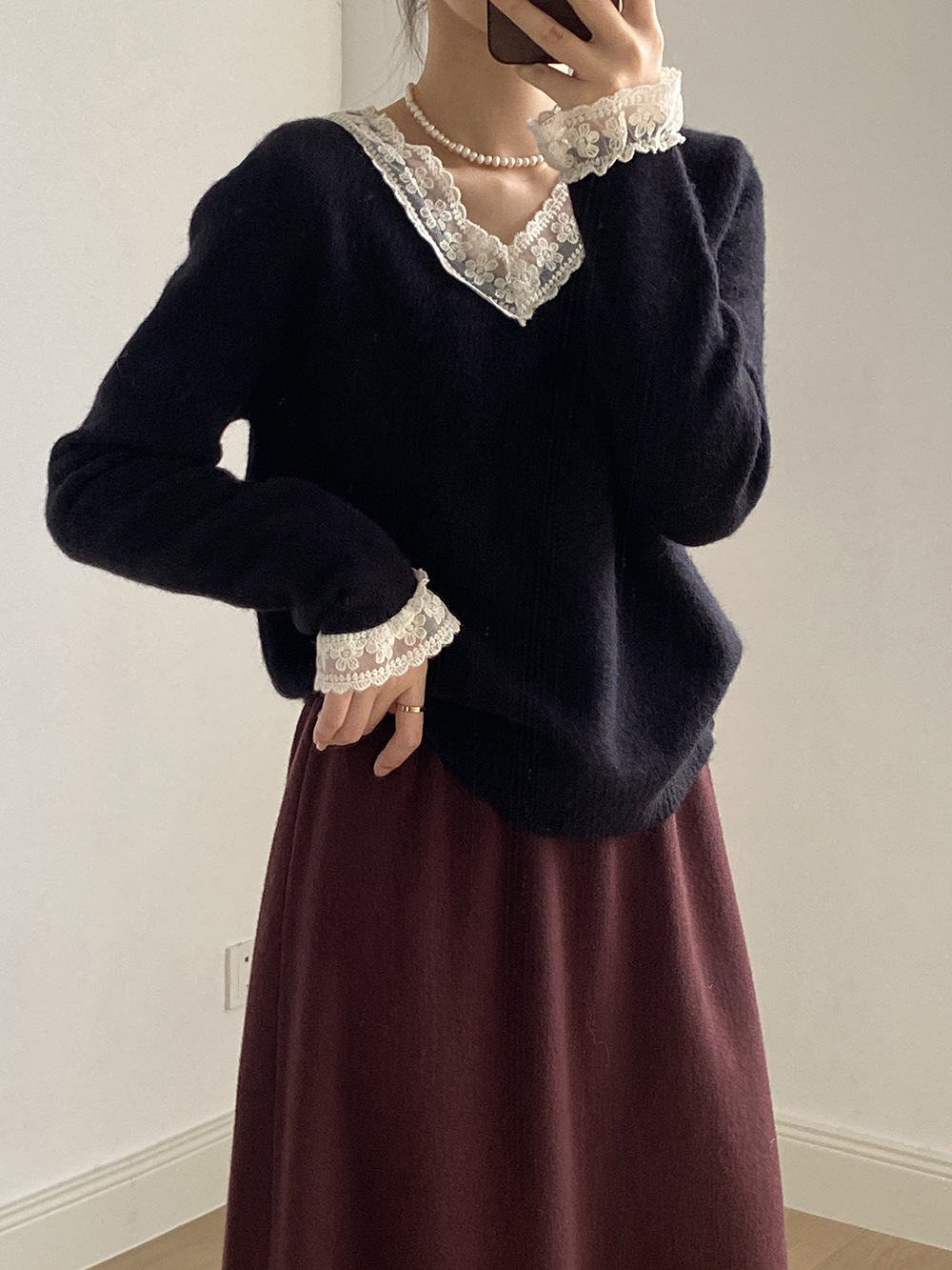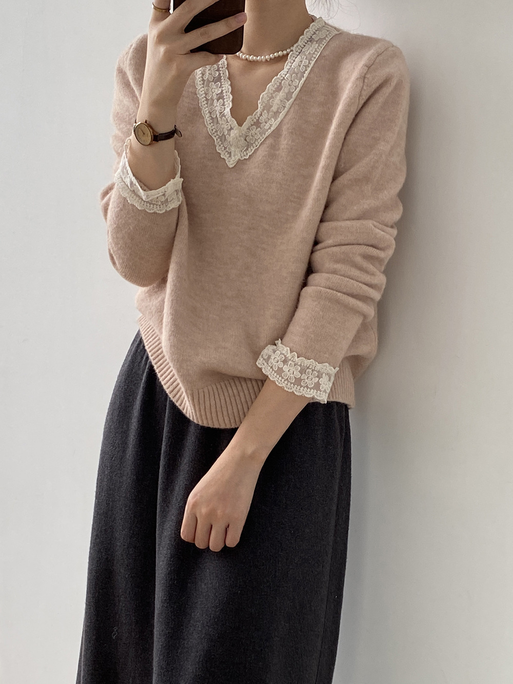 *o-ha-you*【FYSP10170】V領拼接蕾絲花邊打底衫 2024冬季寬鬆針織內搭上衣-7色-如有需要請先諮詢