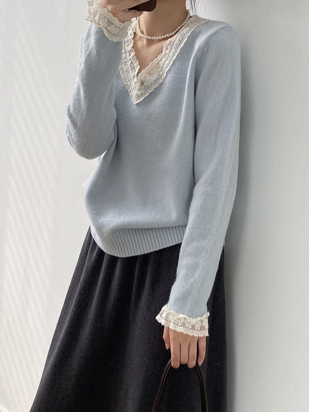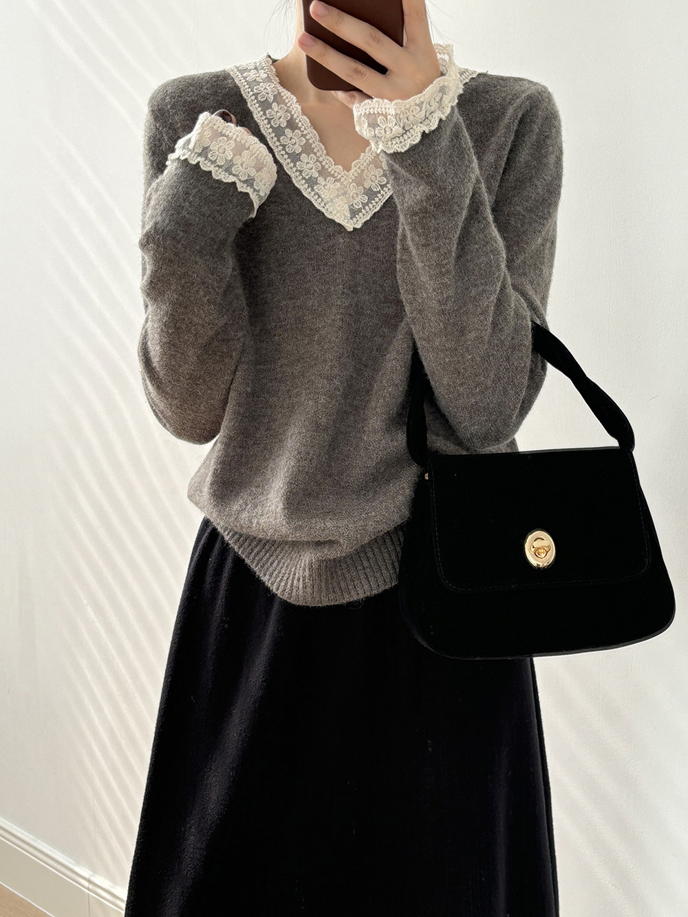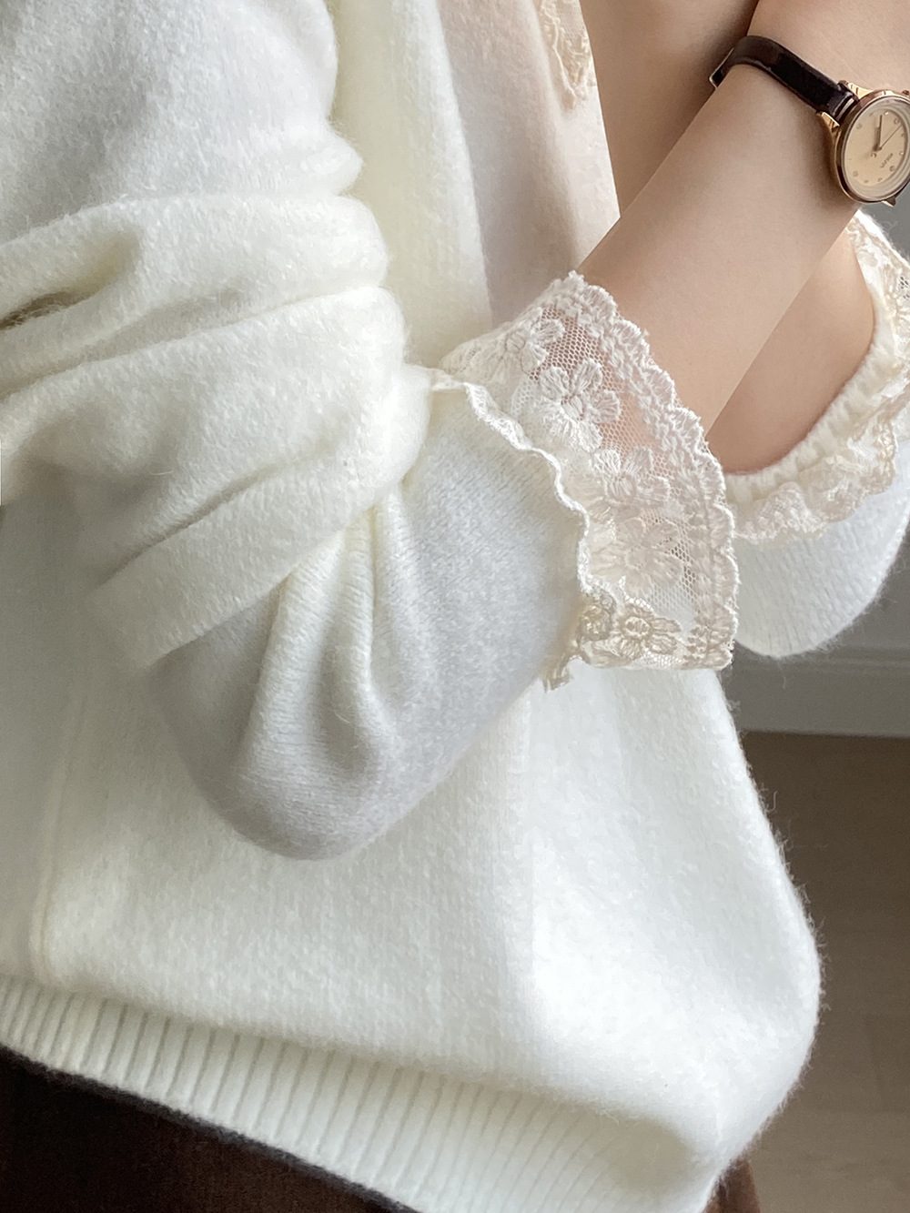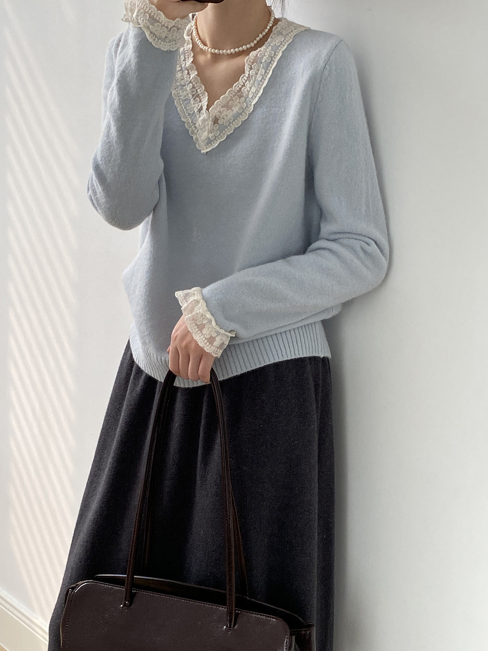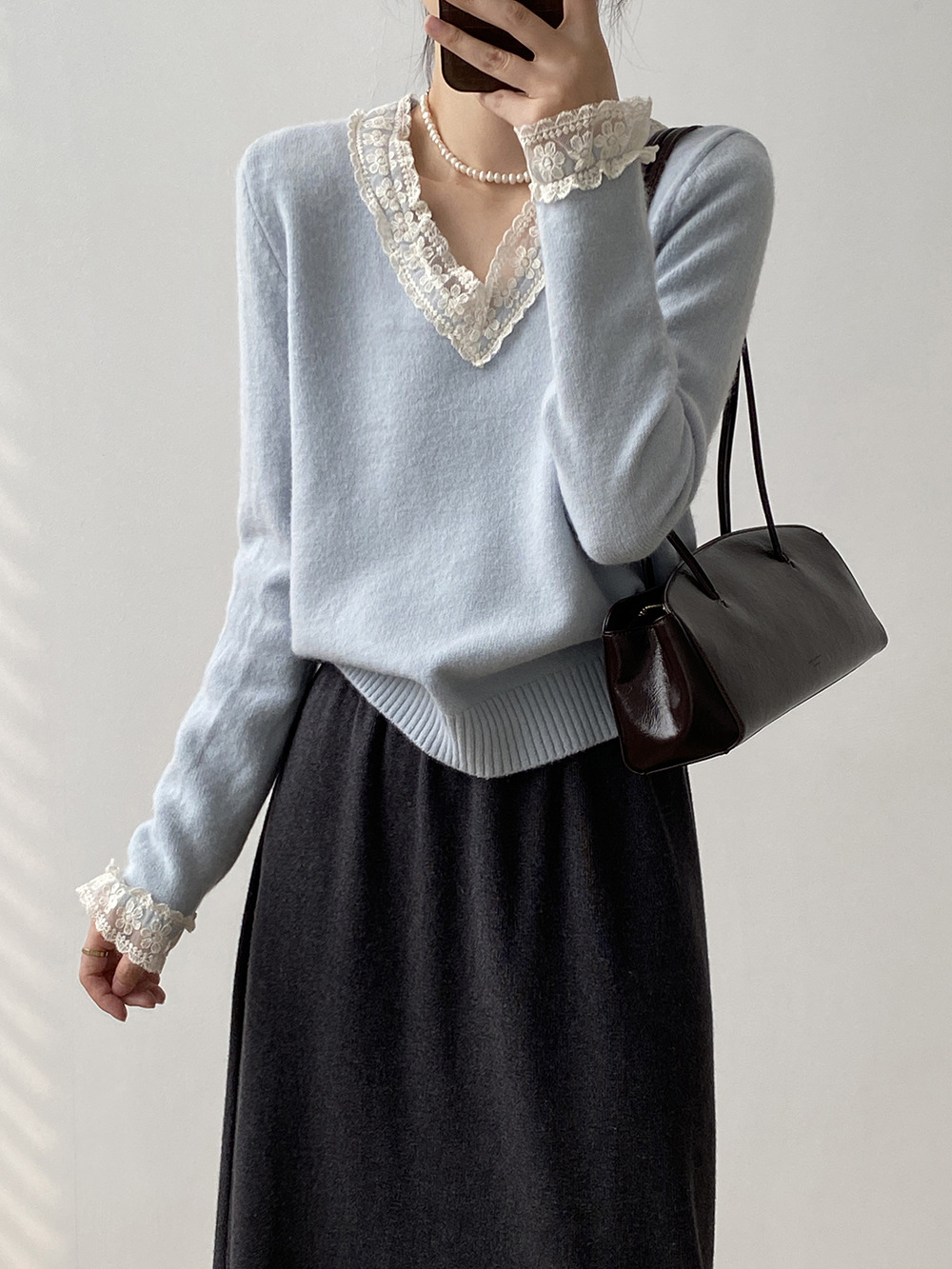 *o-ha-you*【FYSP10170】V領拼接蕾絲花邊打底衫 2024冬季寬鬆針織內搭上衣-7色-如有需要請先諮詢