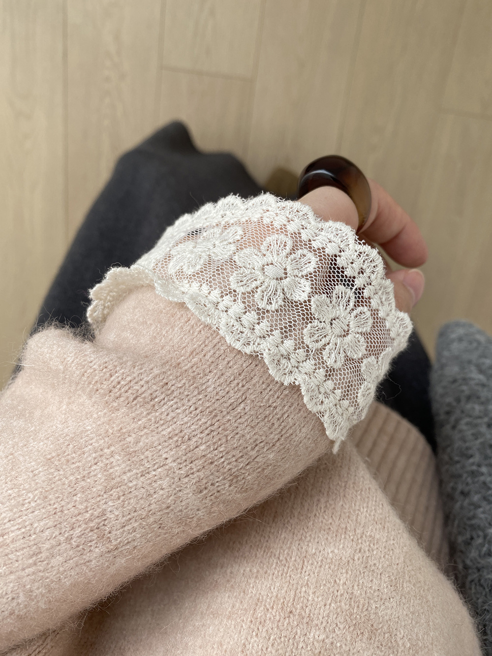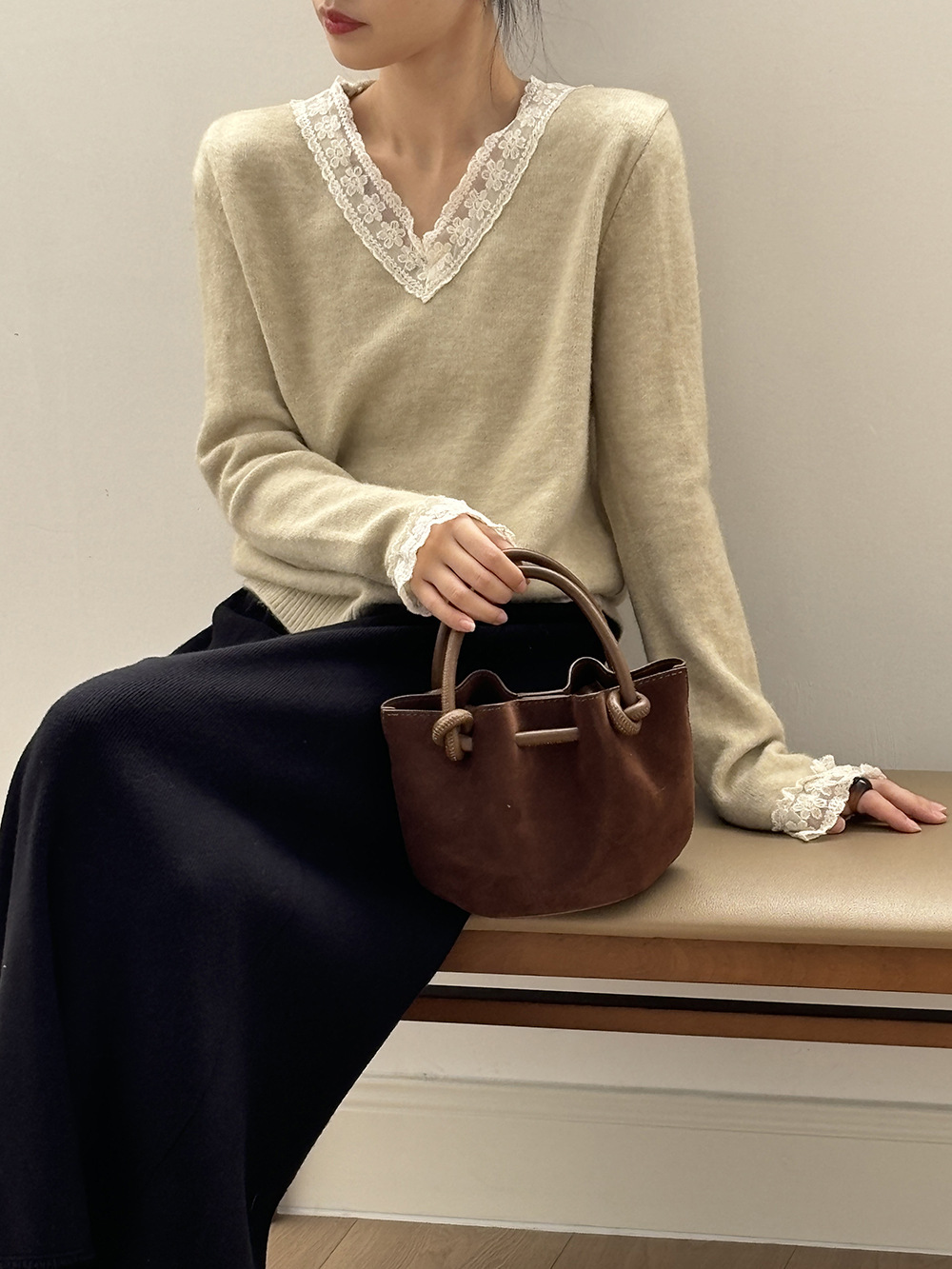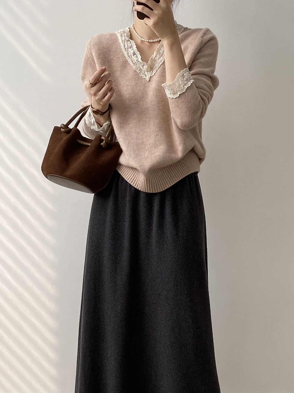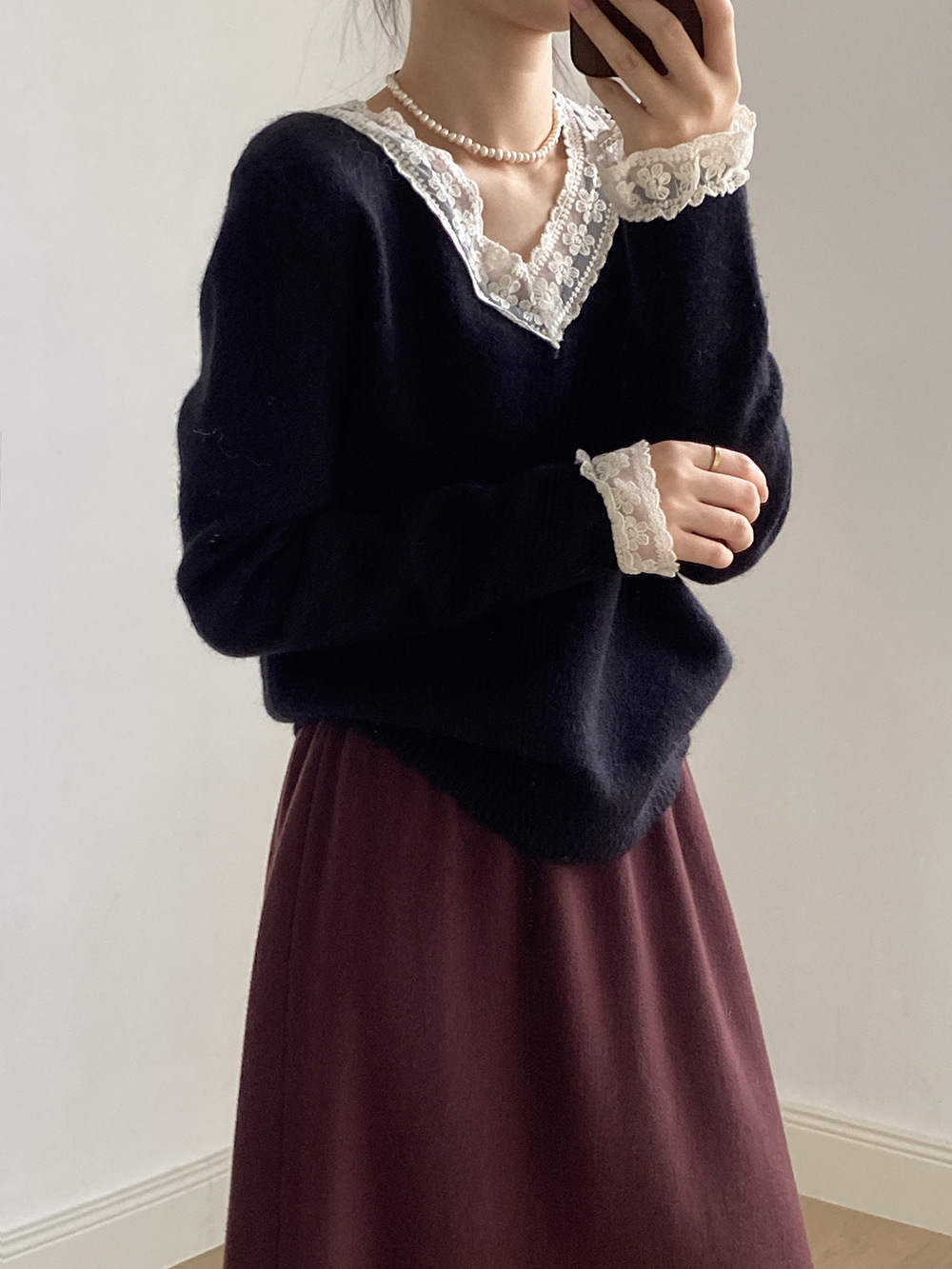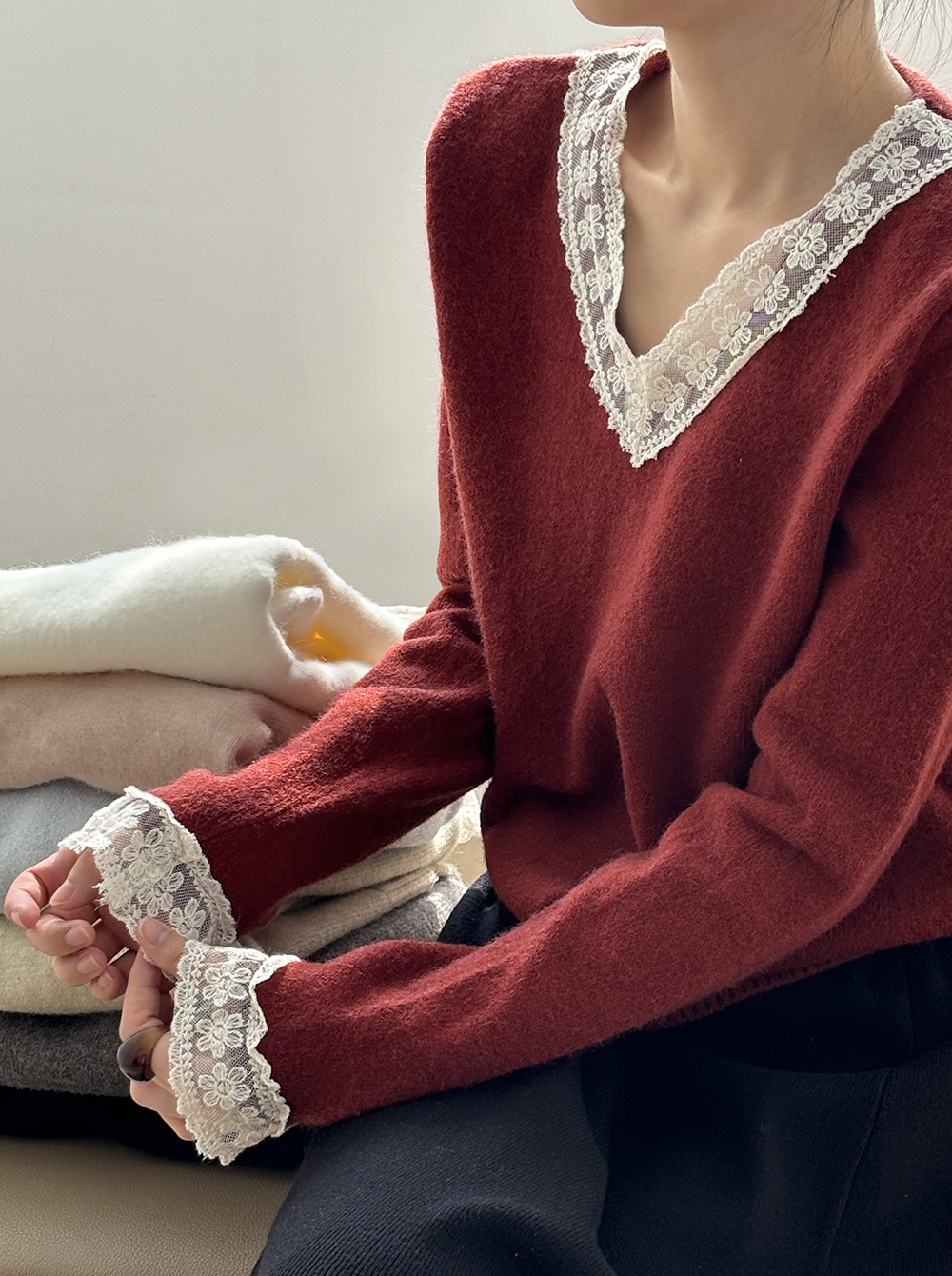 *o-ha-you*【FYSP10170】V領拼接蕾絲花邊打底衫 2024冬季寬鬆針織內搭上衣-7色-如有需要請先諮詢