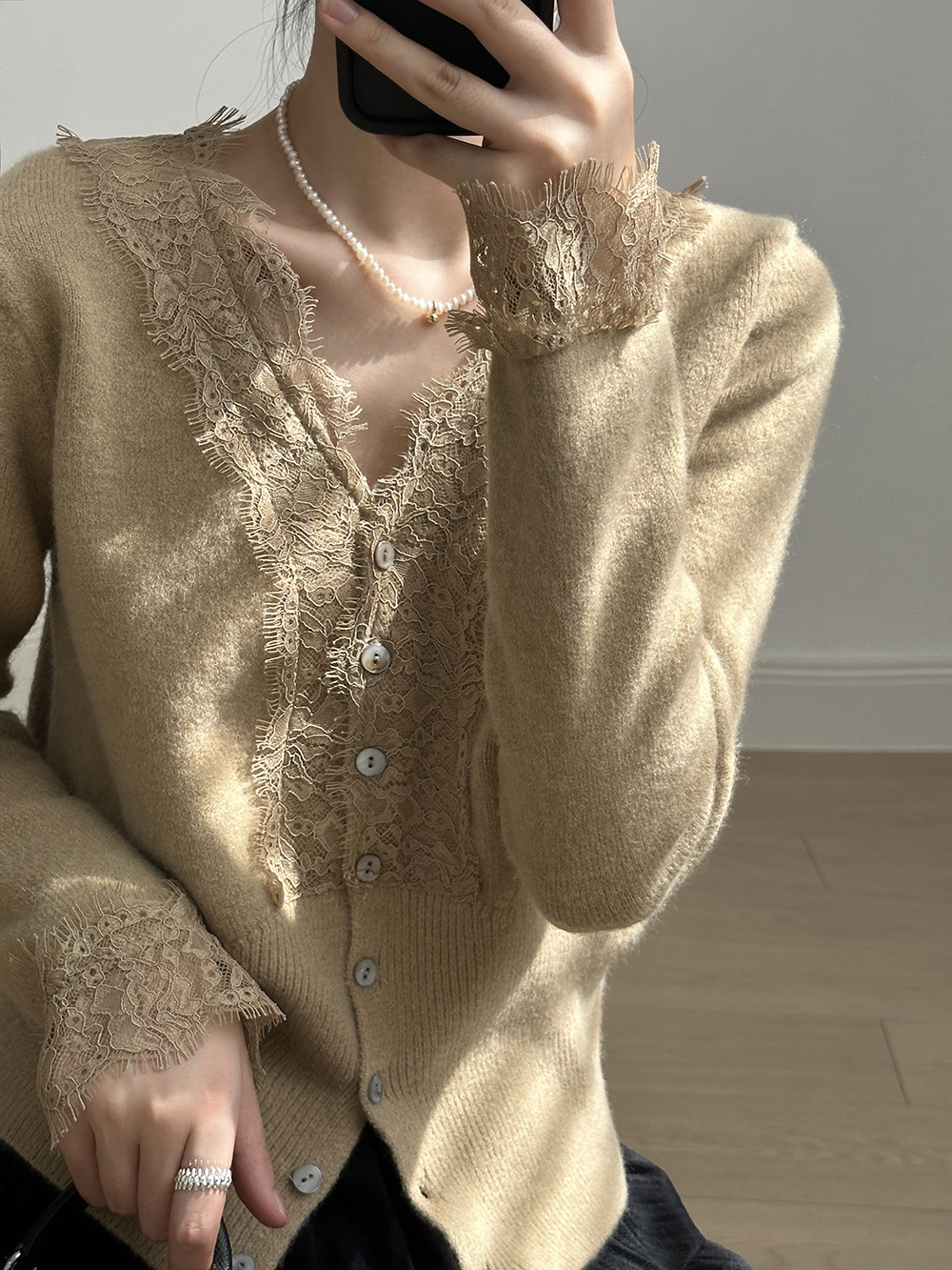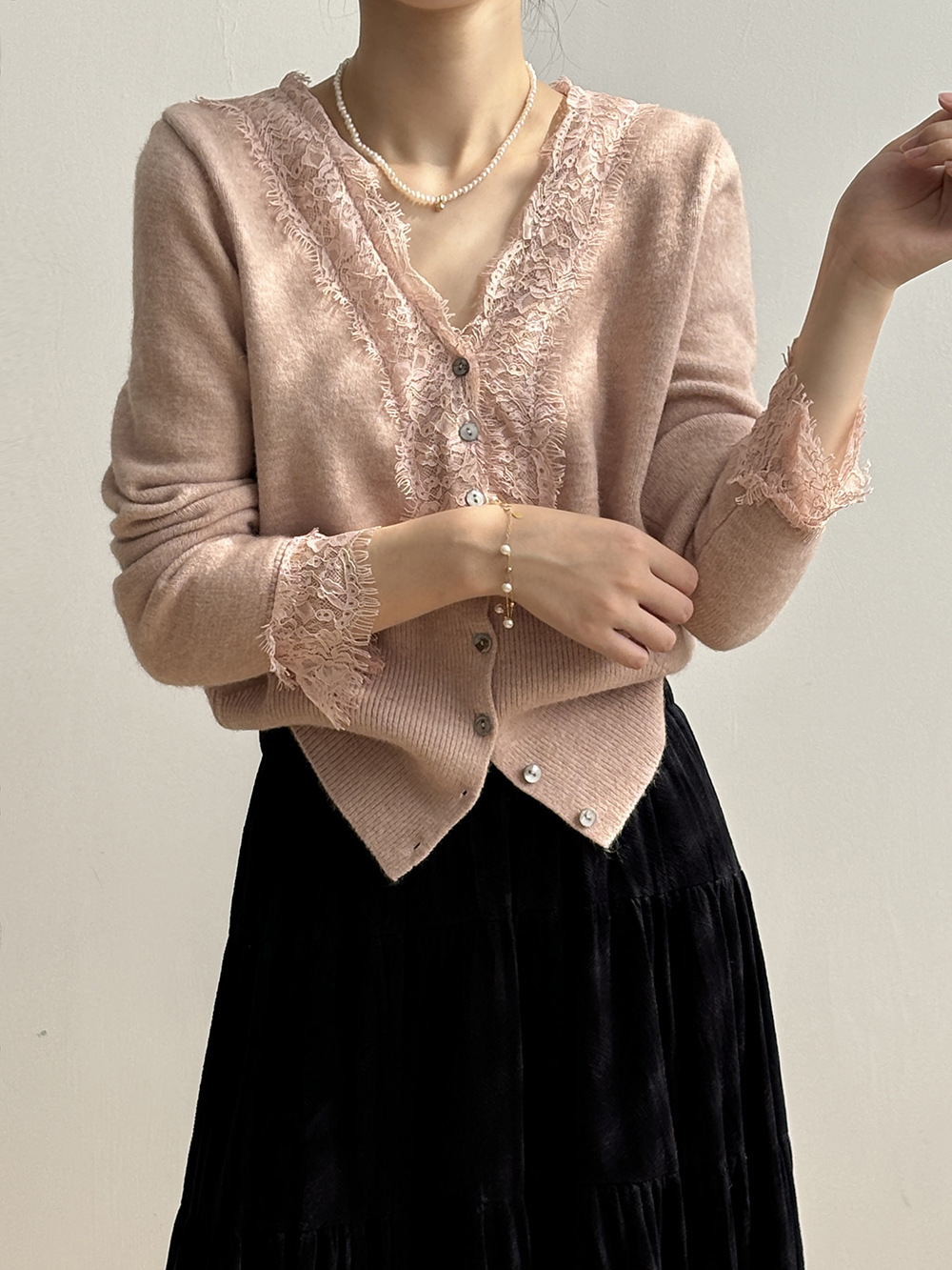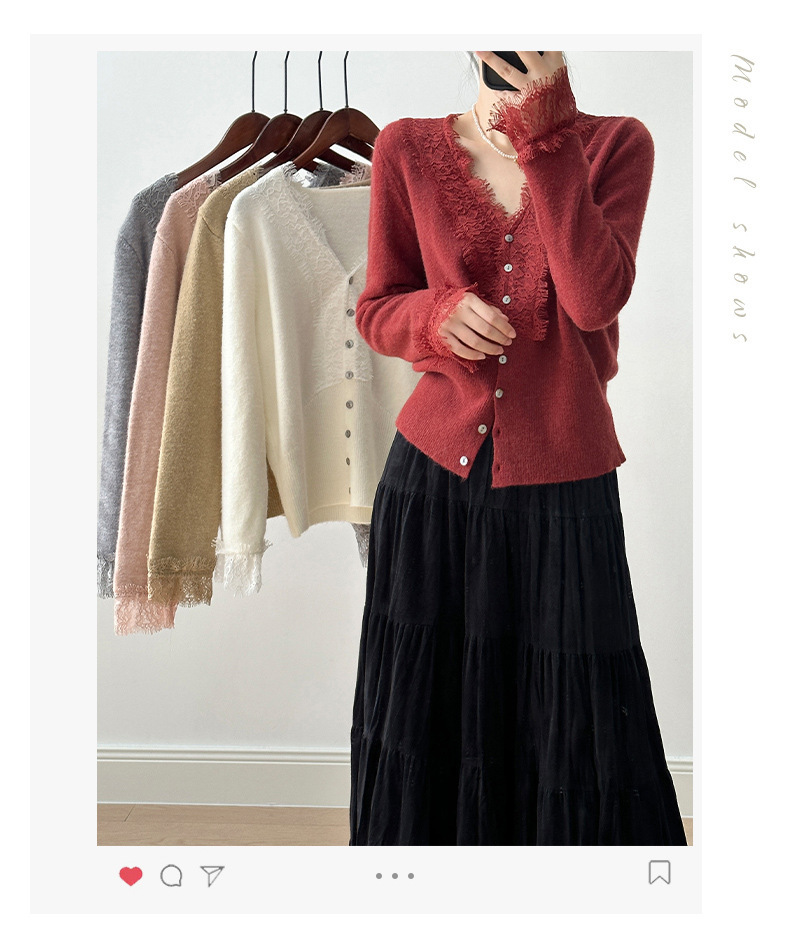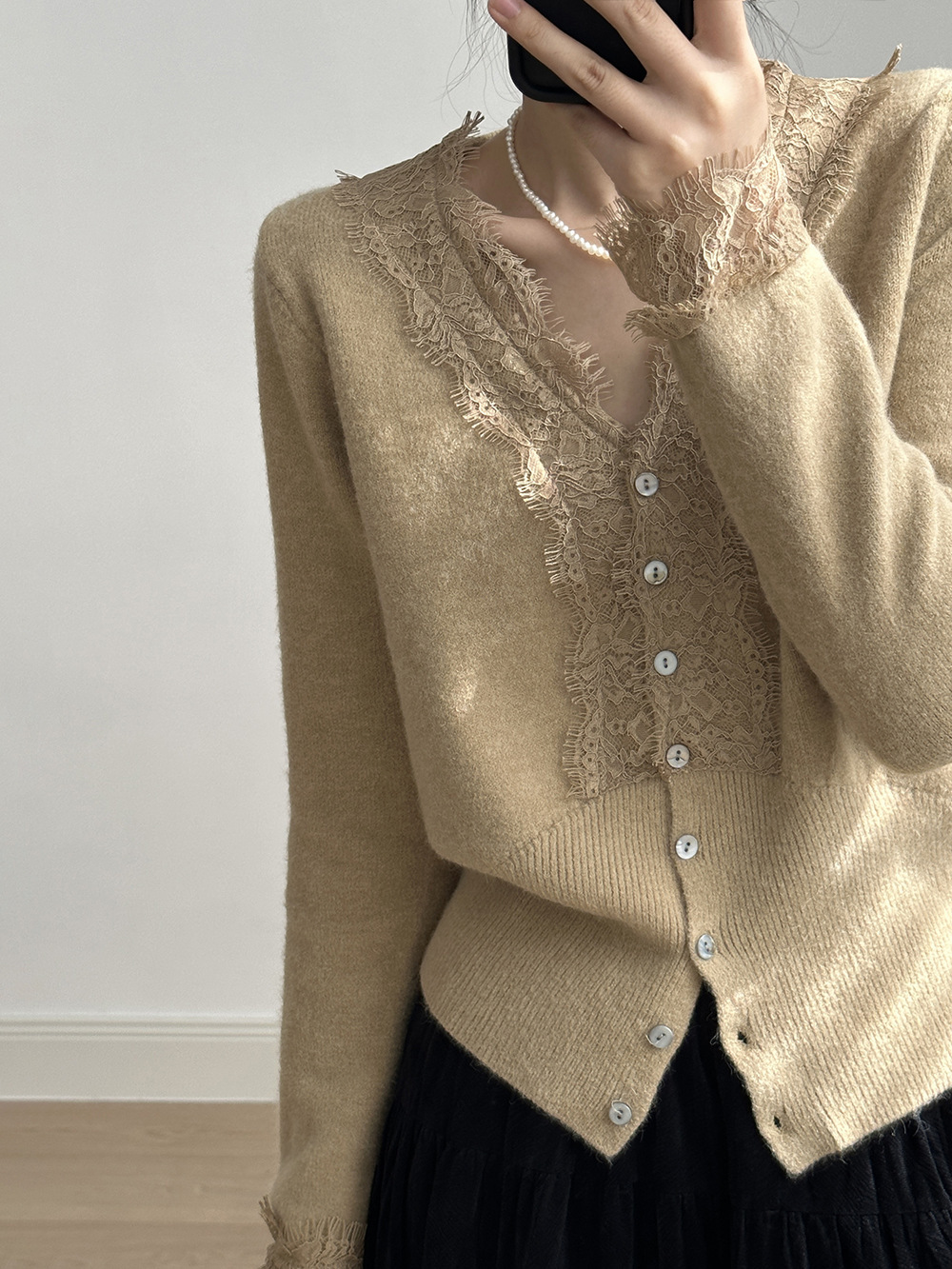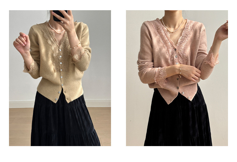 *o-ha-you*【FYSP10680】軟糯V領蕾絲拼接針織開襟衫2024秋冬氣質長袖內搭上衣-5色-如有需要請先諮詢