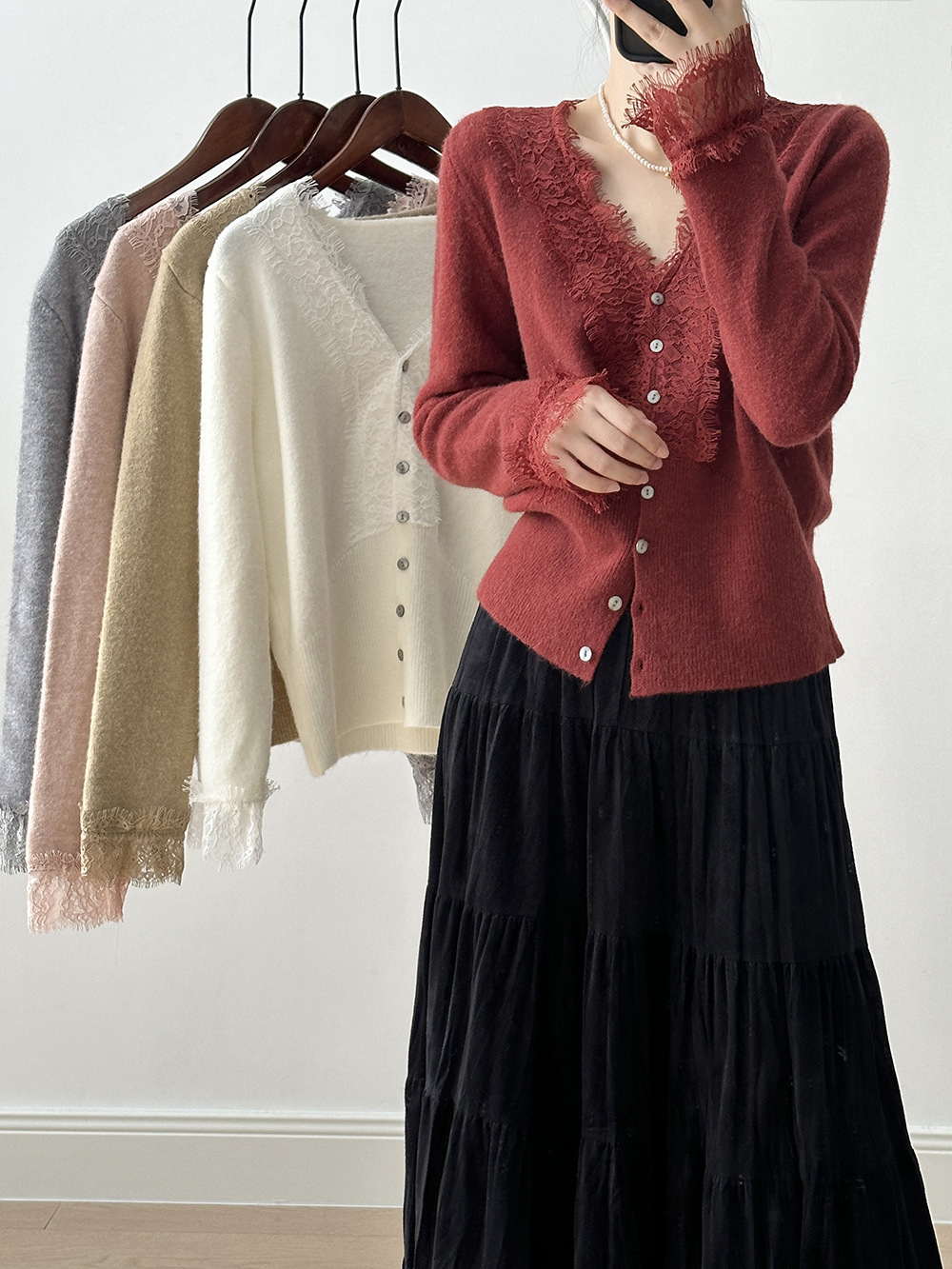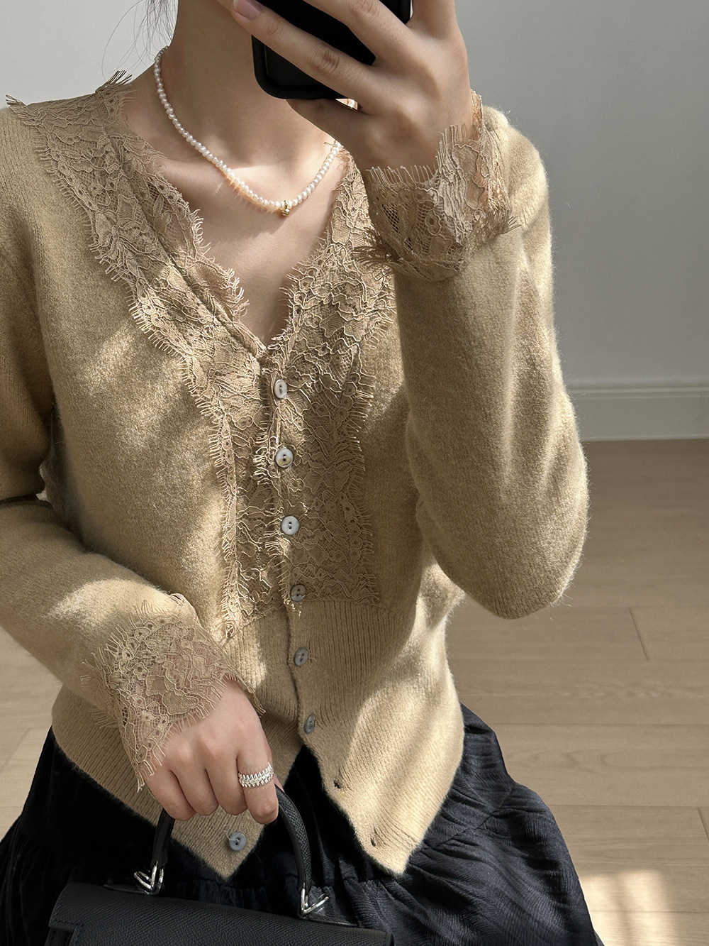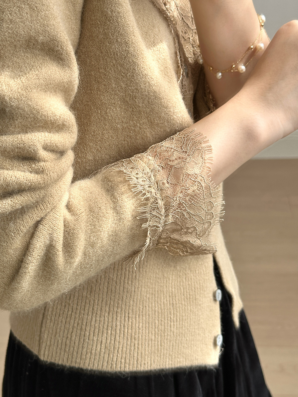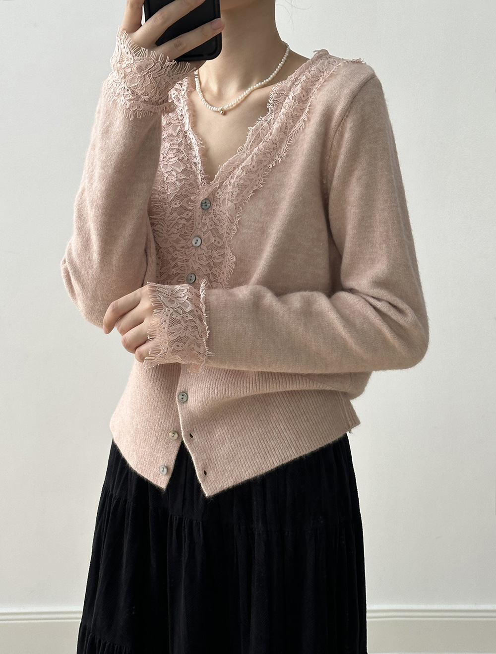 *o-ha-you*【FYSP10680】軟糯V領蕾絲拼接針織開襟衫2024秋冬氣質長袖內搭上衣-5色-如有需要請先諮詢
