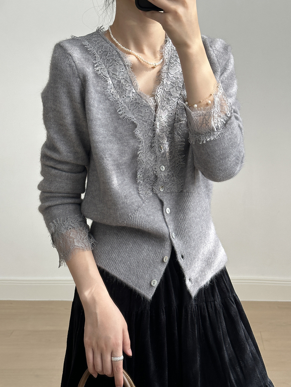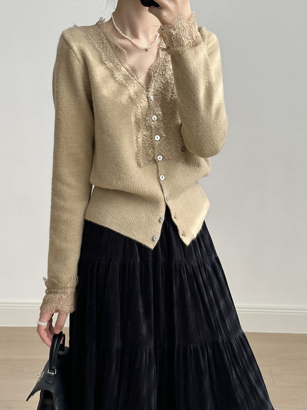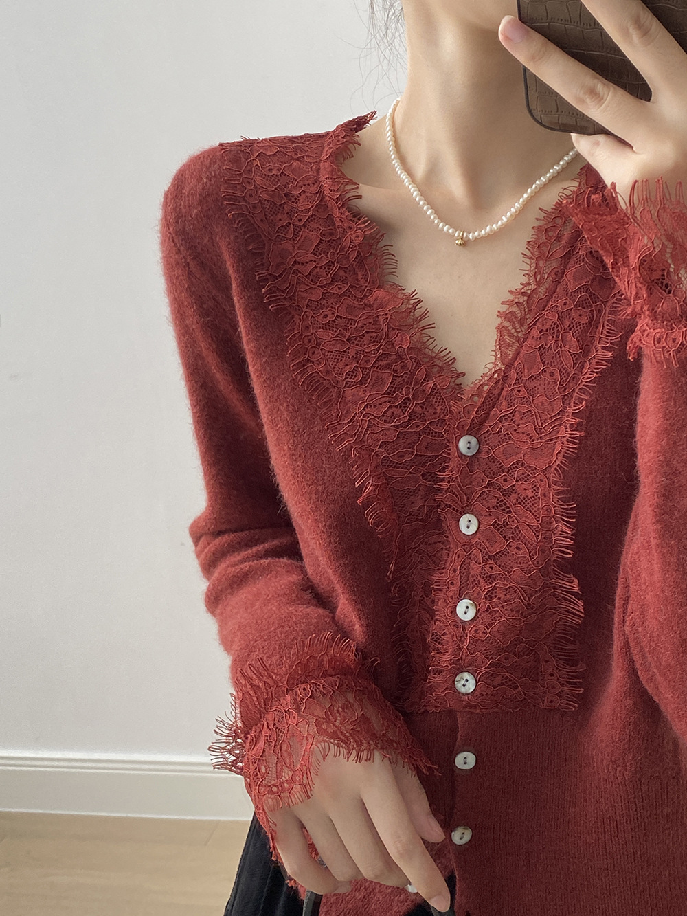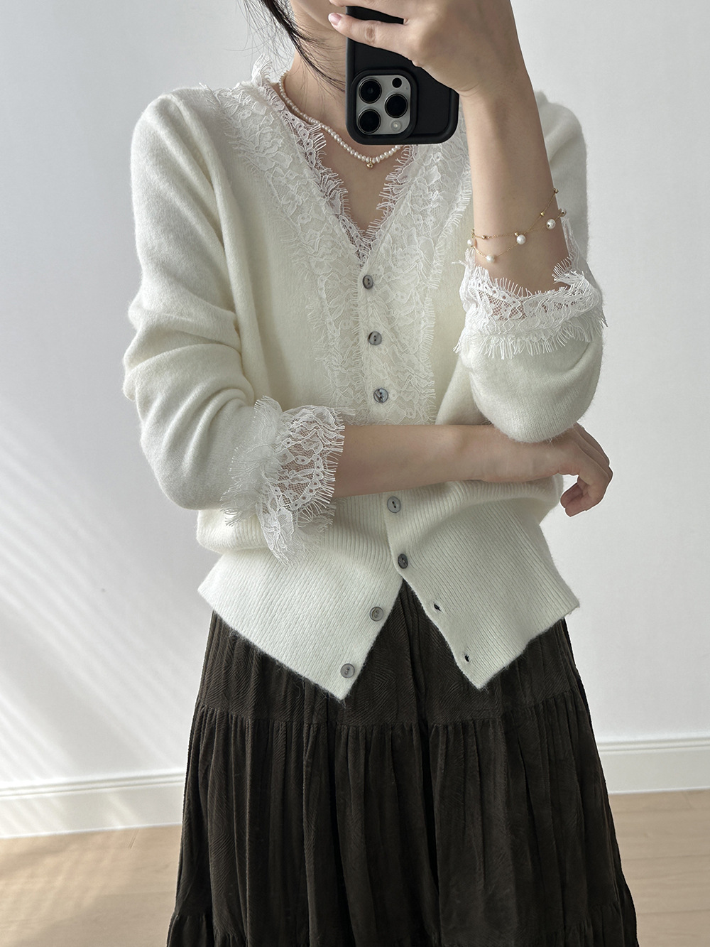 *o-ha-you*【FYSP10680】軟糯V領蕾絲拼接針織開襟衫2024秋冬氣質長袖內搭上衣-5色-如有需要請先諮詢