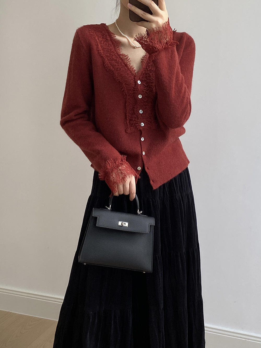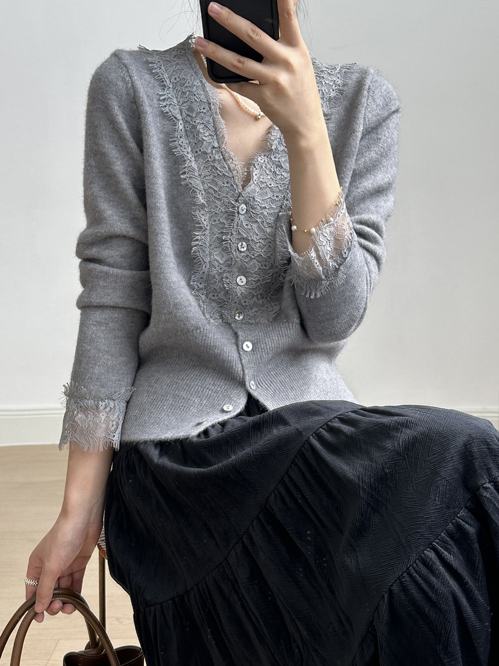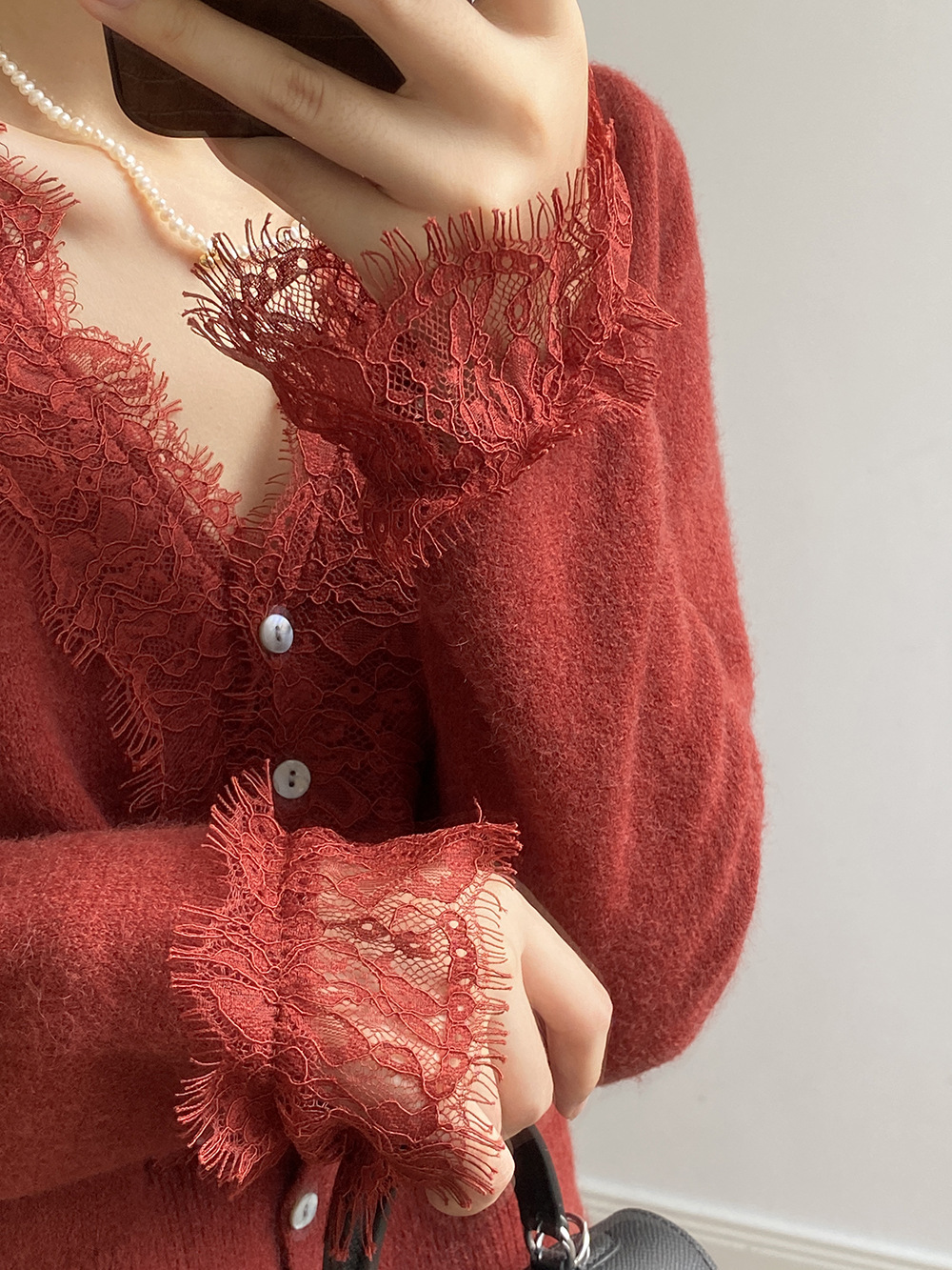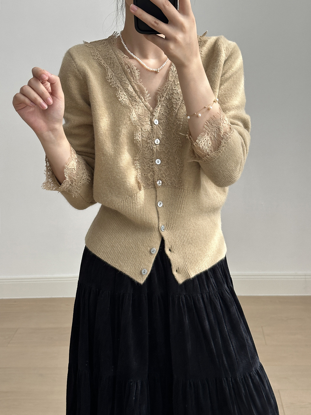 *o-ha-you*【FYSP10680】軟糯V領蕾絲拼接針織開襟衫2024秋冬氣質長袖內搭上衣-5色-如有需要請先諮詢